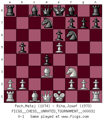 Last move : 0-1 2013 May 21 13:25:32 [Event "FICGS__CHESS__UNRATED_TOURNAMENT__000031"] [Site "FICGS"] [Date "2013.03.08"] [Round "1"] [White "Pech,Matej"] [Black "Riha,Josef"] [Result "0-1"] [WhiteElo "1074"] [BlackElo "1973"] 1.c4 c6 2.d4 d5 3.Nf3 Nf6 4.Nc3 e6 5.e3 Nbd7 6.Bd3 dxc4 7.Bxc4 b5 8.Bd3 a6 9.e4 c5 10.e5 cxd4 11.Nxb5 axb5 0-1 English : Caro-Kann defensive system Player Black won this chess game. Follow this game move after move (download)The passed pawn is a criminal, who should be kept under lock and key. Mild measures, such as police surveillance, are not sufficient. (Nimzovitch) Ich hatte meine größten Erfolge, als ich 47 Jahre alt war. Kasparow war noch nicht mal 42 und hat das Schach schon im Stich gelassen. (Viktor Kortschnoi) El Ajedrez detiene a su maestro dentro de sus propios vínculos, encadenando la mente y el cerebro, por lo que la libertad interior del mas fuerte debe sufrir. (Albert Einstein) Shah mat. Le roi est mort. Cri de fierté d'un joueur venant de terrasser son adversaire, courtoisement, sans effusion de sang. You must do what you feel is right... of course. (Obi-Wan Kenobi in Star Wars ep.4)