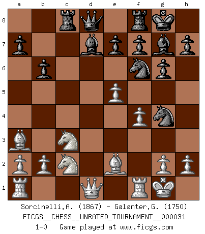 Last move : 1-0 2013 May 17 6:20:57 [Event "FICGS__CHESS__UNRATED_TOURNAMENT__000031"] [Site "FICGS"] [Date "2013.03.08"] [Round "1"] [White "Sorcinelli,Andrea"] [Black "Galanter,Gregory"] [Result "1-0"] [WhiteElo "1867"] [BlackElo "1750"] 1.e4 c5 2.Nf3 Nc6 3.d4 cxd4 4.Nxd4 g6 5.c4 Bg7 6.Be3 Nf6 7.Nc3 O-O 8.Be2 d6 9.O-O Bd7 10.Nc2 Ne5 11.c5 dxc5 12.f4 Neg4 13.Bxc5 b6 14.Ba3 Rc8 15.e5 1-0 Sicilian : Accelerated Fianchetto, Maroczy bind, 6.Be3 Kingside Castling by player Black (move 7) Kingside Castling by player White (move 9) Player White won this chess game. Follow this game move after move (download)The essence of Chess is thinking about what Chess is. (David Bronstein) Schach ist ein Kampf gegen den Fehler. (Johannes Herrman Zukertort) El Ajedrez por encima de todo... ¡es una pelea!. (Emanuel Lasker) Roi des jeux et jeu des rois, les échecs portent en eux un sentiment d'infini. Ils donnent à celui qui s'est efforcé d'en approfondir les arcanes l'impression de n'être pas à la mesure de l'homme; en fait, ils constituent un résumé de l'univers, un microcosme, et figurent cette grande échelle qui, dans les plans de la lumière descend jusqu'à la matière, qui des abîmes insondables remonte jusqu'en l'infini de Dieu. (Pyrame) I've never seen so many men wasted so badly. (Blondie in The Good, The Bad and The Ugly)