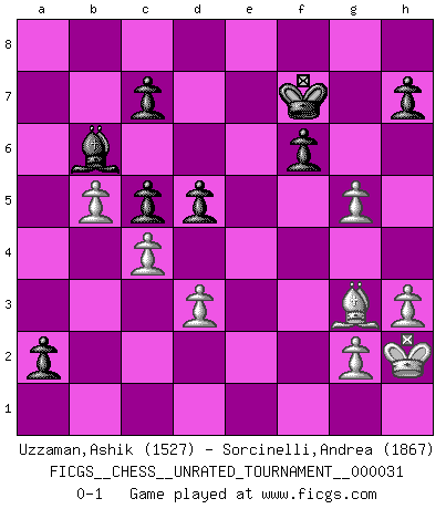 Last move : 0-1 2013 March 27 15:37:56 [Event "FICGS__CHESS__UNRATED_TOURNAMENT__000031"] [Site "FICGS"] [Date "2013.03.08"] [Round "1"] [White "Uzzaman,Ashik"] [Black "Sorcinelli,Andrea"] [Result "0-1"] [WhiteElo "1527"] [BlackElo "1867"] 1.e4 e5 2.Nf3 Nc6 3.d4 exd4 4.Bc4 Nf6 5.e5 d5 6.Bb5 Ne4 7.Nxd4 Bd7 8.Bxc6 bxc6 9.O-O Bc5 10.Nc3 Nxc3 11.bxc3 O-O 12.Nb3 Bb6 13.a4 a5 14.Qe2 Qh4 15.Be3 Qe4 16.Rfe1 Qxe5 17.Qd2 Qd6 18.Bf4 Qf6 19.Be5 Qg6 20.Nd4 Rae8 21.Re3 Qh5 22.Rae1 f6 23.Bg3 Rxe3 24.Rxe3 Re8 25.h3 Rxe3 26.Qxe3 Qd1+ 27.Kh2 Kf7 28.Qd3 Qxd3 29.cxd3 c5 30.Nb5 Bxb5 31.axb5 g5 32.f4 a4 33.fxg5 a3 34.c4 a2 0-1 Scotch gambit : Dubois-Reti defense Kingside Castling by player White (move 9) Kingside Castling by player Black (move 11) Player Black won this chess game. Follow this game move after move (download)Mistrust is the most necessary characteristic of the Chess player. (Siegbert Tarrasch) Schach ist gnadenlos. Du mußt bereit sein zu töten. (Nigel Short) Un jugador que es sorprendido, esta derrotado a medias. (Proverbio) Les pièces de l'échiquier étaient impitoyables. Elles le retenaient, elles l'absorbaient. Il y avait de l'horreur en cela, mais aussi une harmonie unique. Car, qu'y a-t-il dans le monde, à part les échecs ? (V. Nabokov) The ultimate in disposing one's troops is to be without ascertainable shape. Then the most penetrating spies cannot pry in nor can the wise lay plans against you. (Sun Tzu)