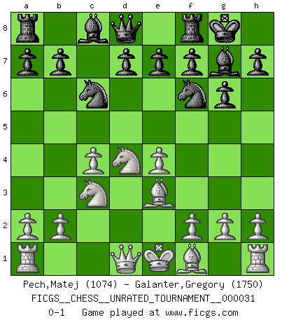 Last move : 0-1 2013 May 18 10:51:37 [Event "FICGS__CHESS__UNRATED_TOURNAMENT__000031"] [Site "FICGS"] [Date "2013.03.08"] [Round "1"] [White "Pech,Matej"] [Black "Galanter,Gregory"] [Result "0-1"] [WhiteElo "1074"] [BlackElo "1750"] 1.e4 c5 2.Nf3 Nc6 3.d4 cxd4 4.Nxd4 g6 5.c4 Bg7 6.Be3 Nf6 7.Nc3 O-O 0-1 This chess game has been lost on time (started : 2013.03.08 14:40:0) Sicilian : Accelerated Fianchetto, Maroczy bind, 6.Be3 Kingside Castling by player Black (move 7) Player Black won this chess game. Follow this game move after move (download)An attack on the wing should be met by play in the center. (Nimzovitch) Ich bewundere Kasparows phantasievolle Angriffssiege aus den Achtzigern und Neunzigern, aber wenn man sie mit dem Computer überprüft, nimmt der Computer in jeder zweiten Partie die Opfer an, verteidigt sich und gewinnt. (Vladimir Kramnik) El Rey es una pieza de pelea. ¡Usenlo!. (Wilhelm Steinitz) Les Echecs sont affaire de jugement sensible. Savoir quand frapper et quand esquiver. (Fischer) Drag your thoughts away from your troubles... by the ears, by the heels, or any other way you can manage it. (Mark Twain)