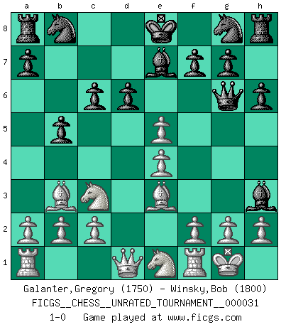 Last move : 1-0 2013 June 17 13:16:34 [Event "FICGS__CHESS__UNRATED_TOURNAMENT__000031"] [Site "FICGS"] [Date "2013.03.08"] [Round "1"] [White "Galanter,Gregory"] [Black "Winsky,Bob"] [Result "1-0"] [WhiteElo "1750"] [BlackElo "1800"] 1.e4 e5 2.Nf3 Qf6 3.Nc3 c6 4.Bc4 Be7 5.d3 h6 6.O-O d6 7.Be3 Qg6 8.d4 Bg4 9.dxe5 Bh3 10.Ne1 b5 11.Bb3 1-0 Greco defense Kingside Castling by player White (move 6) Player White won this chess game. Follow this game move after move (download)Chess demands total concentration. (Bobby Fischer) Schach ist eine Sache der genauen Beurteilung, wann man zuschlagen und wann man sich ducken muss. (Robert James Fischer) Fischer no está bajo la obligación de nadie. (Joseph Platz) Toutes les manuvres exécutées sur une colonne ouverte ont pour but ultime l'intrusion définitive sur la septième ou la huitième rangée, en plein cur de la position ennemie. (Aaron Nimzovitch) At work, the authority of a person is inversely proportional to the number of pens that person is carrying. (Dan Rotaru)