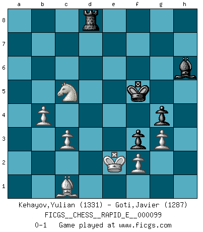 Last move : 0-1 2013 May 28 23:40:11 [Event "FICGS__CHESS__RAPID_E__000099"] [Site "FICGS"] [Date "2013.03.09"] [Round "1"] [White "Kehayov,Yulian"] [Black "Goti,Javier"] [Result "0-1"] [WhiteElo "1331"] [BlackElo "1287"] 1.e4 c5 2.Bc4 e6 3.Nf3 d5 4.exd5 exd5 5.Be2 Be6 6.h3 g6 7.O-O Bg7 8.c3 Nc6 9.d3 Nf6 10.Bg5 O-O 11.d4 b6 12.Bb5 Qd6 13.Bxc6 Qxc6 14.dxc5 bxc5 15.Na3 Ne4 16.Be3 a5 17.Ng5 Nxg5 18.Bxg5 Bc8 19.Nc2 Bb7 20.Qf3 f5 21.Rad1 Qd7 22.a3 d4 23.Qd3 Be4 24.Qc4+ Bd5 25.Qxc5 Rfc8 26.Qb6 Rc6 27.Qb5 Bc4 28.Qa4 Bxf1 29.Kxf1 d3 30.Nb4 Rd6 31.Qxd7 Rxd7 32.Rxd3 Rxd3 33.Nxd3 h6 34.Be3 g5 35.Ke2 f4 36.Bd2 Re8+ 37.Kf3 Rd8 38.Ke2 Kf7 39.b4 axb4 40.axb4 h5 41.Nc5 Bh6 42.Bc1 Kg6 43.Kf3 Kf5 44.g3 g4+ 45.hxg4+ hxg4+ 46.Ke2 f3+ 0-1 Sicilian defense Kingside Castling by player White (move 7) Kingside Castling by player Black (move 10) Player Black won this chess game. Follow this game move after move (download)It's always better to sacrifice your opponent's men. (Savielly Tartakover) Wenn Capablanka heute auf der Schachbühne erscheinen würde, hätte er ein halbes Jahr gebraucht um sich die Schachtheorie anzueignen. Und dann hätte er alles und jeden besiegt. (Mikhail Moiseyevich Botvinik) Hay dos clases de hombres: aquellos que se conforman en dejarse llevar por las circunstancias y que juegan barajas y aquellos decididos a controlar las circunstancias y que juegan al Ajedrez. (Mortimer Collins) Il (Jacob Murray) ne joue pas pour le bon coup, mais pour le meilleur. (Eloi Relange) I don't know, I don't care, and it doesn't make any difference. (Albert Einstein)