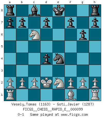Last move : 0-1 2013 June 2 12:12:9 [Event "FICGS__CHESS__RAPID_E__000099"] [Site "FICGS"] [Date "2013.03.09"] [Round "1"] [White "Vesely,Tomas"] [Black "Goti,Javier"] [Result "0-1"] [WhiteElo "1163"] [BlackElo "1287"] 1.e4 c5 2.Nf3 Nc6 3.Nc3 g6 4.d4 cxd4 5.Ne2 e5 6.Bg5 Nf6 7.Nxe5 Qa5+ 8.Qd2 Bb4 9.Nxc6 Bxd2+ 10.Bxd2 Qxd2+ 11.Kxd2 Nxe4+ 0-1 This chess game has been lost on time (started : 2013.03.09 7:7:4) Sicilian defense Player Black won this chess game. Follow this game move after move (download)I'd rather have a Pawn than a finger. (Reuben Fine) Wenn Spassky eine Figur opfert kannst du genauso gut aufgeben. Aber wenn Tal eine Figur opfert, spiel weiter. Er könnte noch eine weitere opfern, und dann ... wer weiß? (Miguel Najdorf) Aquel que toma al Peón de Caballo de la Reina, se pasará la noche a dormir en la calle. (Anónimo) J'apprécie les joueurs d'est-indienne, c'est grâce à eux que je nourris ma famille depuis tant d'années. (Petrosian) The ego is not master in its own house. (Sigmund Freud)