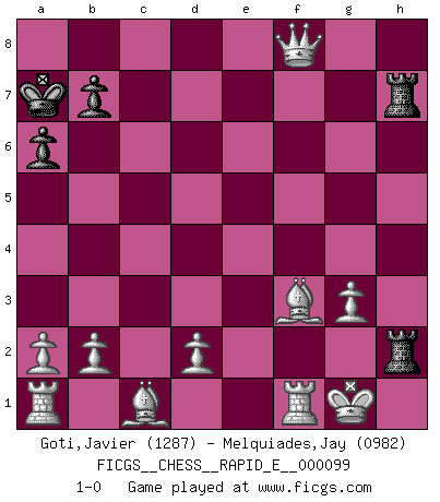 Last move : 1-0 2013 April 24 8:34:9 [Event "FICGS__CHESS__RAPID_E__000099"] [Site "FICGS"] [Date "2013.03.09"] [Round "1"] [White "Goti,Javier"] [Black "Melquiades,Jay"] [Result "1-0"] [WhiteElo "1287"] [BlackElo "0982"] 1.c4 e5 2.Nc3 c6 3.e3 d5 4.cxd5 cxd5 5.g3 a6 6.Bg2 Nf6 7.Nge2 d4 8.exd4 exd4 9.Qa4+ Bd7 10.Qxd4 Nc6 11.Qe3+ Be7 12.O-O Ng4 13.Qe4 h5 14.Nd5 h4 15.h3 Nh2 16.Kxh2 Bxh3 17.Bxh3 hxg3+ 18.fxg3 Qd7 19.Nef4 O-O-O 20.Nb6+ Kb8 21.Nxd7+ Rxd7 22.Kg2 R7d8 23.Nd5 Rhe8 24.Nxe7 Rxe7 25.Qf4+ Re5 26.Qxf7 Ka7 27.Qxg7 Re2+ 28.Kg1 Ne5 29.Bg2 Rd7 30.Qf8 Ng4 31.Bh3 Rh7 32.Bxg4 Reh2 33.Bf3 1-0 English Opening Kingside Castling by player White (move 12) Queenside Castling by player Black (move 19) Player White won this chess game. Follow this game move after move (download)Chess is imagination. (David Bronstein) Sicherlich können nur Meister einen Stil haben. Daß ein nicht-Meister auch nur ein einziges Mal in seinem Leben eine Partie folgerecht durchführte, habe ich niemals bemerkt. (Emanuel Lasker) Un entendimiento a fondo de las continuaciones típicas del mate, hace de las combinaciones de sacrificio mas complicadas conducirlas a ellas no solo sin dificultad, sino casi de una manera natural. (Siegbert Tarrasch) On est toujours la mazette de quelqu'un d'autre. (Anonyme) The only sure thing about luck is that it will change. (Wilson Mizner)