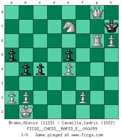 Last move : 1-0 2013 March 11 21:20:7 [Event "FICGS__CHESS__RAPID_E__000099"] [Site "FICGS"] [Date "2013.03.09"] [Round "1"] [White "Bromo,Alexis"] [Black "Cavaille,Cedric"] [Result "1-0"] [WhiteElo "1123"] [BlackElo "1022"] 1.d4 d5 2.c4 dxc4 3.Nc3 c6 4.e4 e6 5.Bxc4 b6 6.Nf3 c5 7.d5 exd5 8.Bxd5 Nf6 9.Bxa8 Qxd1+ 10.Nxd1 Bg4 11.Bf4 Bxf3 12.gxf3 Nbd7 13.Nc3 Be7 14.O-O-O O-O 15.Bc6 Rd8 16.Bxd7 Nxd7 17.Bc7 Bg5+ 18.Kb1 Re8 19.Rxd7 h6 20.Rg1 Re7 21.Rxe7 Bxe7 22.Nd5 Bh4 23.Be5 Bg5 24.h4 f6 25.hxg5 fxe5 26.gxh6 g6 27.Ne7+ Kh7 28.Rxg6 Kh8 29.f4 a5 30.f5 b5 31.f6 Kh7 32.f7 c4 33.f8Q b4 34.Qg8+ 1-0 Queen's gambit accepted Queenside Castling by player White (move 14) Kingside Castling by player Black (move 14) Promotion Queen by player White (move 33) Player White won this chess game. Follow this game move after move (download)Everything is in a state of flux, and this includes the world of Chess. (Mikhail Botvinnik) Auf jeden Fall musst du zuerst Rechtsanwalt werden, damit du deine eigenen Interessen und die deiner Familie vertreten kannst. [Brief an seinen Sohn] (José Raúl Capablanca) Ciertamente el estado mental actual de Bobby Fischer es una tragedia. Uno de los mas grandes jugadores de Ajedrez del mundo -el orgullo y pena del Ajedrez Americano. (Frank Brady) Tout change constamment, y compris dans le monde des Echecs. (Botvinnik) The ultimate in disposing one's troops is to be without ascertainable shape. Then the most penetrating spies cannot pry in nor can the wise lay plans against you. (Sun Tzu)