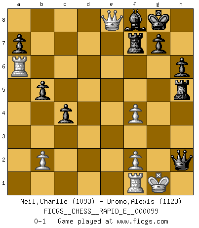Last move : 0-1 2013 March 15 6:8:45 [Event "FICGS__CHESS__RAPID_E__000099"] [Site "FICGS"] [Date "2013.03.09"] [Round "1"] [White "Neil,Charlie"] [Black "Bromo,Alexis"] [Result "0-1"] [WhiteElo "1093"] [BlackElo "1123"] 1.Nf3 d5 2.c4 dxc4 3.e4 b5 4.a4 c6 5.d4 Bg4 6.Nc3 e6 7.Be2 Bxf3 8.Bxf3 Bb4 9.axb5 cxb5 10.O-O Nc6 11.Ne2 Nge7 12.Bf4 O-O 13.Be3 h6 14.e5 f5 15.exf6 Rxf6 16.Nf4 Nd5 17.Ra6 Rc8 18.Nh5 Rf7 19.Qe2 Nxe3 20.Qxe3 Nxd4 21.Qe5 Nxf3+ 22.gxf3 Rc5 23.Qxe6 Rxh5 24.f4 Qh4 25.Qe8+ Bf8 26.Kg2 Qh3+ 27.Kg1 Qxh2+ 0-1 Reti accepted Kingside Castling by player White (move 10) Kingside Castling by player Black (move 12) Player Black won this chess game. Follow this game move after move (download)All Chess players should have a hobby. (Savielly Tartakower) Wenn ich gewinne bin ich ein Genie. Wenn nicht, dann bin ich keines. (Robert James Fischer) Por tratar de evitar la pérdida de una pieza, muchas personas han perdido una partida de Ajedrez. (Savielly Tartakover) On peut tirer plus d'utilité d'une partie perdue que de 100 parties gagnées. (Capablanca) Imagination is more important than knowledge. Knowledge is limited. Imagination encircles the world. (Albert Einstein)