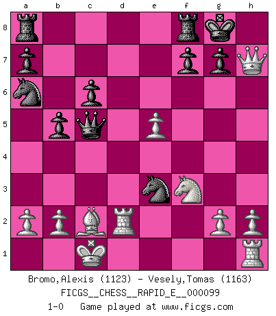 Last move : 1-0 2013 March 14 21:6:47 [Event "FICGS__CHESS__RAPID_E__000099"] [Site "FICGS"] [Date "2013.03.09"] [Round "1"] [White "Bromo,Alexis"] [Black "Vesely,Tomas"] [Result "1-0"] [WhiteElo "1123"] [BlackElo "1163"] 1.d4 d5 2.c4 e5 3.Nc3 dxc4 4.e4 exd4 5.Nd5 d3 6.Qa4+ c6 7.Nf4 Qd4 8.Bxd3 Bc5 9.Be3 Qe5 10.Qxc4 Bxe3 11.fxe3 b5 12.Qb3 Nf6 13.Nf3 Qc5 14.Bc2 O-O 15.e5 Ng4 16.O-O-O Nxe3 17.Rd2 Bf5 18.Nd3 Bxd3 19.Qxd3 Na6 20.Qxh7+ 1-0 QGD : Albin counter-gambit Kingside Castling by player Black (move 14) Queenside Castling by player White (move 16) Player White won this chess game. Follow this game move after move (download)I have always a slight feeling of pity for the man who has no knowledge of Chess. (Siegbert Tarrasch) Jeder Schachmeister war einmal ein Anfänger. (Irving Chernev) Aquellos que dicen que entienden al Ajedrez, no entienden nada. (Robert Hubner) La solitude du joueur d'Echecs à l'approche du mat est semblable à celle du condamné. (Francis Szpiner) Whoever said the pen is mightier than the sword obviously never encountered automatic weapons. (US General Douglas MacArthur)