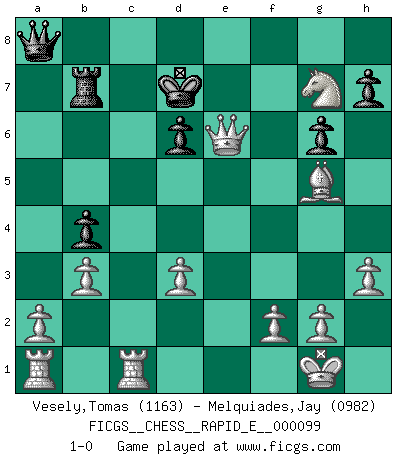 Last move : 1-0 2013 April 12 2:12:23 [Event "FICGS__CHESS__RAPID_E__000099"] [Site "FICGS"] [Date "2013.03.09"] [Round "1"] [White "Vesely,Tomas"] [Black "Melquiades,Jay"] [Result "1-0"] [WhiteElo "1163"] [BlackElo "0982"] 1.e4 e5 2.Nf3 d6 3.c4 Bg4 4.Nc3 Nc6 5.h3 Be6 6.Nd5 Bxd5 7.cxd5 Nf6 8.Bb5 a6 9.dxc6 axb5 10.cxb7 Ra4 11.O-O Nxe4 12.b3 Ra7 13.d3 Nc3 14.Qc2 Nd5 15.Qc6+ Ke7 16.Qxd5 Ke8 17.Ng5 Be7 18.Nxf7 Qb8 19.Nxh8 Kd7 20.Be3 Rxb7 21.Nf7 c6 22.Nxe5+ Kc8 23.Nxc6 b4 24.Rfc1 Qa8 25.Nxe7+ Kd7 26.Nf5 g6 27.Ng7 Kd8 28.Bg5+ Kd7 29.Qe6+ 1-0 Philidor's defense Kingside Castling by player White (move 11) Player White won this chess game. Follow this game move after move (download)I have always a slight feeling of pity for the man who has no knowledge of Chess. (Siegbert Tarrasch) Besser ein falscher Plan, logisch durchgeführt, als gar kein Plan. (Viktor Kortschnoi) Tu no necesitas jugar muy bien, únicamente ayudar a tu oponenet a que juegue muy mal. (Genrikh Chepukaitis) Je ne crois pas en la psychologie, je crois aux bons coups. (Robert Fischer) A belief is an idea the mind possesses, an idea that possesses the mind. (Robert Oxden Bolton)