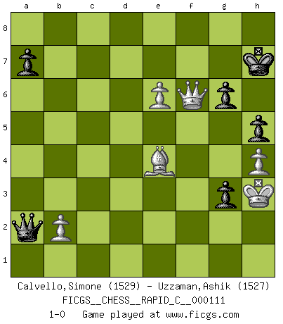 Last move : 1-0 2013 July 12 2:37:18 [Event "FICGS__CHESS__RAPID_C__000111"] [Site "FICGS"] [Date "2013.03.09"] [Round "1"] [White "Calvello,Simone"] [Black "Uzzaman,Ashik"] [Result "1-0"] [WhiteElo "1529"] [BlackElo "1527"] 1.e4 c5 2.Nc3 g6 3.g3 Bg7 4.Bg2 Nc6 5.d3 Nf6 6.f4 d6 7.Nf3 O-O 8.O-O Bg4 9.h3 Bxf3 10.Qxf3 Nd4 11.Qf2 Qb6 12.e5 dxe5 13.fxe5 Nd7 14.Nd5 Qd8 15.c3 Nc6 16.d4 cxd4 17.cxd4 Nb6 18.Nxb6 Qxb6 19.Be3 Qc7 20.Rac1 Qd7 21.Rc5 Rac8 22.Rfc1 f6 23.e6 Qd6 24.d5 Rfd8 25.dxc6 bxc6 26.Rxc6 Rxc6 27.Rxc6 Qd1+ 28.Qf1 Qa4 29.Qc4 Qd1+ 30.Kh2 h5 31.Qc2 Qe1 32.Rc8 Rxc8 33.Qxc8+ Kh7 34.Qc3 Qe2 35.Qd2 Qa6 36.Qd5 f5 37.Qd7 Bf6 38.Bc5 Qxa2 39.Bxe7 Bxe7 40.Qxe7+ Kh6 41.h4 f4 42.Qf6 fxg3+ 43.Kh3 Kh7 44.Be4 1-0 Sicilian : Closed Kingside Castling by player Black (move 7) Kingside Castling by player White (move 8) Player White won this chess game. Follow this game move after move (download)If your opponent offers you a draw, try to work out why he thinks he's worse off. (Nigel Short) Als er Schachweltmeister wurde ließ er praktisch alle stärksten Sovietspieler für sich arbeiten. Wenn ein auch nur mittelmässiger Meister ein Spezialist für eine bestimmte Eröffnung war, wurde er von Karpov gerufen. Das wurde alles geheim gehalten. (Mikhail Moiseyevich Botvinik) No hay precio que sea tan grande por la cabellera del Rey enemigo. (Koblentz) A chaque perte on perd un peu de soi. (Joël Lautier) Without deviation from the norm, progress is not possible. (Frank Zappa)