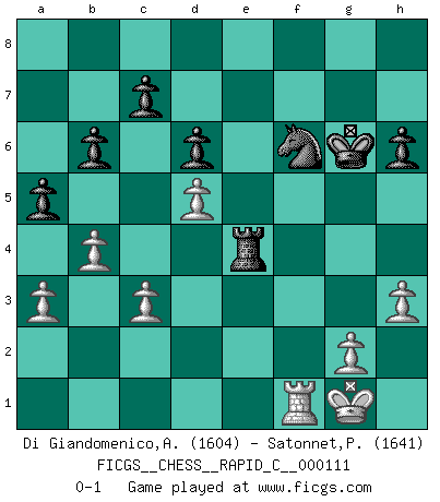 Last move : 0-1 2013 June 22 10:8:26 [Event "FICGS__CHESS__RAPID_C__000111"] [Site "FICGS"] [Date "2013.03.09"] [Round "1"] [White "Di Giandomenico,Alfonso"] [Black "Satonnet,Patrick"] [Result "0-1"] [WhiteElo "1604"] [BlackElo "1641"] 1.e4 e5 2.Bc4 Nf6 3.d3 Nc6 4.c3 Bc5 5.Nf3 d6 6.O-O a6 7.Nbd2 O-O 8.h3 Ba7 9.Re1 Be6 10.Qb3 Na5 11.Qc2 Nxc4 12.Nxc4 Bxc4 13.dxc4 h6 14.Be3 Bxe3 15.Rxe3 Qe8 16.Nh4 Qe6 17.Nf5 Kh7 18.Qe2 g6 19.Ng3 Nd7 20.Rd1 b6 21.b4 a5 22.a3 f5 23.exf5 gxf5 24.Qd3 Rae8 25.Ne2 e4 26.Qd5 Qxd5 27.cxd5 f4 28.Nxf4 Rxf4 29.f3 Nf6 30.fxe4 R8xe4 31.Rxe4 Rxe4 32.Rf1 Kg6 0-1 Bishop's Opening : Berlin defense Kingside Castling by player White (move 6) Kingside Castling by player Black (move 7) Player Black won this chess game. Follow this game move after move (download)Look at Garry Kasparov. After he loses, invariably he wins the next game. He just kills the next guy. That's something that we have to learn to be able to do. (Maurice Ashley) Drei Punkte vor allen anderen ist wie einer, der im weißen Anzug posiert, während der Rest in Müllsäcke gekleidet dasteht. (Viktor Kortschnoi) Hoy en día, si tu no eres un Gran Maestro a los 14 años, es mejor que lo olvides. (Anand Viswanathan) C'est une question de caractère, Beaucoup de gens perdent leur motivation très vite. D'autres, ils sont rares, peuvent la conserver très longtemps. J'aime les échecs, encore aujourd'hui je suis heureux d'analyser des parties. J'aime toujours gagner, je déteste encore perdre. Bien jouer est important pour mon intégrité intellectuelle et morale. Et puis les échecs vivent en ce moment une période historique grâce à Internet. Ils se développent dans les systèmes éducatifs à travers le monde. Ils sortent de leur ghetto, et c'est mon rôle de mener à bien cette révolution. (Gary Kasparov) When the going gets tactical, the computers get going. (Hyatt)