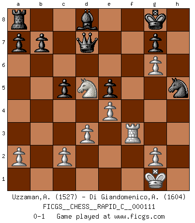 Last move : 0-1 2013 March 23 8:1:0 [Event "FICGS__CHESS__RAPID_C__000111"] [Site "FICGS"] [Date "2013.03.09"] [Round "1"] [White "Uzzaman,Ashik"] [Black "Di Giandomenico,Alfonso"] [Result "0-1"] [WhiteElo "1527"] [BlackElo "1604"] 1.e4 c5 2.Nc3 e6 3.f4 d6 4.Bb5+ Bd7 5.Bxd7+ Nxd7 6.Nf3 Ngf6 7.O-O Be7 8.f5 O-O 9.fxe6 fxe6 10.Ng5 Ne8 11.Nxe6 Rxf1+ 12.Qxf1 Qc8 13.Nd5 Bf6 14.Qf4 Kh8 15.d3 Bd4+ 16.Be3 Bxb2 17.Rf1 Bf6 18.Ng5 Ne5 19.Qh4 h6 20.Qh5 Qd7 21.Bf4 Kg8 22.h4 hxg5 23.hxg5 Bd8 24.Bxe5 dxe5 25.g6 Nf6 26.Rf3 Nxh5 0-1 Sicilian : Closed Kingside Castling by player White (move 7) Kingside Castling by player Black (move 8) Player Black won this chess game. Follow this game move after move (download)Some sacrifices are sound; the rest are mine. (Mikhail Tal) Woher wissen wir, daß der Neanderthaler Blindschach gespielt hat? -- Bei Ausgrabungen wurden keine Schachbretter und Figuren gefunden. (Anonymous) Aquellos que dicen entender al Ajedrez, no entienden nada. (Robert Hubner) Mon pion favori sur ma case favorite ! Bronstein en parlant d'un coup de pion en h5 quand il avait les Noirs. Information on the Internet is subject to the same rules and regulations as conversation at a bar. (George Lundberg)