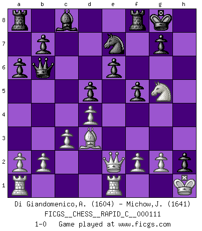 Last move : 1-0 2013 June 9 0:42:34 [Event "FICGS__CHESS__RAPID_C__000111"] [Site "FICGS"] [Date "2013.03.09"] [Round "1"] [White "Di Giandomenico,Alfonso"] [Black "Michow,Jordan"] [Result "1-0"] [WhiteElo "1604"] [BlackElo "1641"] 1.e4 e6 2.d4 Nf6 3.Bg5 Be7 4.Nd2 h6 5.Bxf6 Bxf6 6.e5 Be7 7.Ngf3 O-O 8.Bd3 d5 9.exd6 cxd6 10.O-O a6 11.c3 Nc6 12.Re1 Qb6 13.Qc2 f5 14.Bc4 d5 15.Bd3 Bg5 16.Nxg5 hxg5 17.Nf3 g4 18.Ng5 Ne7 19.h3 gxh3 20.Qe2 h2+ 21.Kh1 1-0 This chess game has been lost on time (started : 2013.03.09 20:35:40) French defense Kingside Castling by player Black (move 7) Kingside Castling by player White (move 10) Player White won this chess game. Follow this game move after move (download)The blunders are all there on the board, waiting to be made. (Savielly Tartakover) Kombinieren und Schwarzhandel gehören verboten. (Savielly Grigorievitsch Tartakower) Las piezas de Ajedrez son los bloques del alfabeto que moldean los pensamientos; y esos pensamientos, aunque hagan un diseño visual en el tablero, expresan abstractamente su belleza como un poema. (Marcel Duchamp) Dieu déplace le joueur, et celui-ci la pièce. Quel Dieu derrière Dieu commence donc la trame ? Arturo Perez-Reverte (prix de littérature policière 1993). In every real man a child is hidden that wants to play. (Friedrich Nietzsche)