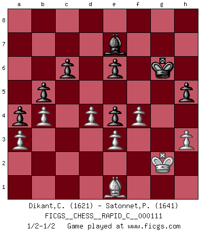 Last move : 1/2-1/2 2013 July 17 21:7:30 [Event "FICGS__CHESS__RAPID_C__000111"] [Site "FICGS"] [Date "2013.03.09"] [Round "1"] [White "Dikant,Christophe"] [Black "Satonnet,Patrick"] [Result "1/2-1/2"] [WhiteElo "1621"] [BlackElo "1641"] 1.d4 d5 2.Nf3 Nc6 3.e3 Bg4 4.Be2 e6 5.O-O Nf6 6.b3 Ne7 7.Bb2 c6 8.Nbd2 Ng6 9.Ne5 Bxe2 10.Qxe2 Bd6 11.f4 O-O 12.c4 Bb4 13.Ndf3 Nxe5 14.Nxe5 Ne4 15.a3 Be7 16.b4 f6 17.Nf3 dxc4 18.Qxc4 Qd5 19.Qc2 a5 20.Nd2 f5 21.Nxe4 fxe4 22.Bc3 a4 23.Rab1 Rf6 24.Be1 R6f8 25.Bg3 Rf5 26.Rfc1 R5f8 27.Qc4 Qxc4 28.Rxc4 h5 29.Be1 Rf5 30.Bd2 Kf7 31.g3 g5 32.Rf1 Rg8 33.fxg5 Rxf1+ 34.Kxf1 Rxg5 35.Rc1 Kg6 36.Kg2 Kf5 37.Rf1+ Kg6 38.Rf4 Rg4 39.h3 Rxf4 40.gxf4 b5 41.Be1 1/2-1/2 Queen's pawn game, Chigorin variation Kingside Castling by player White (move 5) Kingside Castling by player Black (move 11) This chess game ended in a draw. Follow this game move after move (download)Whoever sees no other aim in the game than that of giving checkmate to one's opponent will never become a good Chess player. (Euwe) Ich glaube nicht an Psychologie, ich glaube an gute Züge. (Robert James Fischer) El Ajedrez detiene a su maestro dentro de sus propios vínculos, encadenando la mente y el cerebro, por lo que la libertad interior del mas fuerte debe sufrir. (Albert Einstein) La solitude du joueur d'Echecs à l'approche du mat est semblable à celle du condamné. (Francis Szpiner) Dave, my mind is going. I can feel it. (HAL 9000 in 2001, a space odyssey)