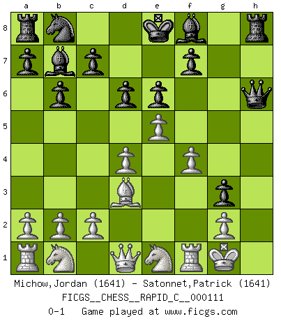 Last move : 0-1 2013 May 15 22:43:53 [Event "FICGS__CHESS__RAPID_C__000111"] [Site "FICGS"] [Date "2013.03.09"] [Round "1"] [White "Michow,Jordan"] [Black "Satonnet,Patrick"] [Result "0-1"] [WhiteElo "1641"] [BlackElo "1641"] 1.e4 e6 2.Nf3 b6 3.d4 Bb7 4.Bd3 Nf6 5.Bg5 h6 6.Bxf6 Qxf6 7.O-O g5 8.h3 h5 9.Ne5 d6 10.Nf3 g4 11.e5 Qg7 12.hxg4 hxg4 13.Ne1 Qh6 14.f4 g3 0-1 This chess game has been lost on time (started : 2013.03.09 20:35:40) French defense Kingside Castling by player White (move 7) Player Black won this chess game. Follow this game move after move (download)Best by test: 1. e4 (Bobby Fischer) Schach ist wie eine schöne Frau, zu der wir ständig zurückkehren, gleichviel, wie oft sie uns zurückweist. (Anonymous) Tu no necesitas jugar muy bien, únicamente ayudar a tu oponenet a que juegue muy mal. (Genrikh Chepukaitis) Les Echecs sont et restent toujours un combat, un combat intégral comme la boxe, la lutte ou un autre sport, et où il doit y avoir un vainqueur et un vaincu. (Joseph Emil Diemer) The production of too many useful things results in too many useless people. (Karl Marx)