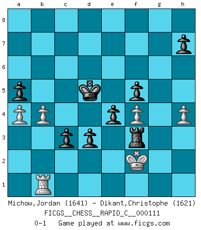 Last move : 0-1 2013 July 3 14:8:17 [Event "FICGS__CHESS__RAPID_C__000111"] [Site "FICGS"] [Date "2013.03.09"] [Round "1"] [White "Michow,Jordan"] [Black "Dikant,Christophe"] [Result "0-1"] [WhiteElo "1641"] [BlackElo "1621"] 1.e4 g6 2.d4 Bg7 3.c3 d6 4.Qf3 c5 5.Bc4 e6 6.Ne2 Nc6 7.d5 Ne5 8.Bb5+ Bd7 9.Bxd7+ Qxd7 10.Qh3 exd5 11.Qxd7+ Kxd7 12.O-O dxe4 13.Nd2 f5 14.f4 Nd3 15.Rd1 Ne7 16.Nc4 b5 17.Ne3 Kc6 18.Rb1 a5 19.Bd2 Rhb8 20.Nc1 c4 21.Nxd3 cxd3 22.a3 d5 23.Rdc1 Kd6 24.b3 d4 25.cxd4 Bxd4 26.Kf1 Bxe3 27.Bxe3 Rc8 28.Ke1 Nd5 29.Kd2 Nxe3 30.Kxe3 Kd5 31.h3 b4 32.a4 Rc3 33.Rxc3 bxc3 34.g4 Rb8 35.gxf5 gxf5 36.h4 Rg8 37.b4 Rg3+ 38.Kf2 Rf3+ 0-1 Robatsch (Modern) defense Kingside Castling by player White (move 12) Player Black won this chess game. Follow this game move after move (download)In order to improve your game, you must study the endgame before everything else, for whereas the endings can be studied and mastered by themselves, the middle game and the opening must be studied in relation to the endgame. (Jose Raul Capablanca) Über Frauen: Chess is better. (Robert James Fischer) El Rey es una pieza de pelea. ¡Usenlo!. (Wilhelm Steinitz) Il (Jacob Murray) ne joue pas pour le bon coup, mais pour le meilleur. (Eloi Relange) Men never do evil so completely and cheerfully as when they do it from religious conviction. (Blaise Pascal)