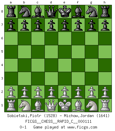 Last move : 0-1 2013 April 9 8:47:5 [Event "FICGS__CHESS__RAPID_C__000111"] [Site "FICGS"] [Date "2013.03.09"] [Round "1"] [White "Sobietski,Piotr"] [Black "Michow,Jordan"] [Result "0-1"] [WhiteElo "1528"] [BlackElo "1641"] 0-1 This chess game has been lost on time (started : 2013.03.09 20:35:40) Player Black won this chess game. Follow this game move after move (download)When you don't know what to do, wait for your opponent to get an idea - it's sure to be wrong. (Tarrasch) Auf jeden Fall musst du zuerst Rechtsanwalt werden, damit du deine eigenen Interessen und die deiner Familie vertreten kannst. [Brief an seinen Sohn] (José Raúl Capablanca) El Ajedrez lo es todo: arte, ciencia y deporte. (Anatoly Karpov) Un millionnaire : 'Monsieur Steinitz ! Vous ne participez aux tournois que pour l'argent, alors que moi je n'y viens que pour l'honneur.' Steinitz : 'Chacun joue pour ce qu'il n'a pas'... It's not a bug - it's an undocumented feature. (Anonymous)
