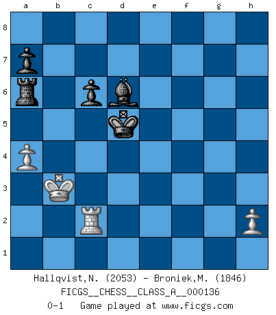 Last move : 0-1 2014 May 5 20:55:26 [Event "FICGS__CHESS__CLASS_A__000136"] [Site "FICGS"] [Date "2013.03.13"] [Round "1"] [White "Hallqvist,Niklas"] [Black "Broniek,Mariusz Maciej"] [Result "0-1"] [WhiteElo "2053"] [BlackElo "1846"] 1.d4 d5 2.g3 c6 3.Bg2 Nf6 4.Nf3 Bf5 5.c4 e6 6.O-O Nbd7 7.Nc3 dxc4 8.Nh4 Bg4 9.f3 Bh5 10.e4 h6 11.g4 g5 12.gxh5 gxh4 13.Qe2 Qa5 14.Bh3 O-O-O 15.Kh1 Nb6 16.Qf2 Nh7 17.Bd2 Rg8 18.f4 Qxh5 19.a4 Kb8 20.a5 Nc8 21.a6 b6 22.e5 f5 23.exf6 Nxf6 24.Bxe6 Rg7 25.Rg1 Rxg1+ 26.Rxg1 h3 27.Be3 Ne7 28.f5 Ned5 29.Nxd5 Nxd5 30.Bf4+ Nxf4 31.Qxf4+ Rd6 32.Rg4 b5 33.Kg1 Kc7 34.Kf2 Kb6 35.Ke2 Kxa6 36.Kd1 Rd8 37.Kc2 Qe8 38.Qf3 Kb6 39.Re4 Qe7 40.f6 Qb4 41.f7 Bg7 42.Bg4 h5 43.Bxh5 Qa4+ 44.Kb1 b4 45.Qf5 b3 46.Qc5+ Ka6 47.Qa3 Qxa3 48.bxa3 c3 49.Bd1 c2+ 50.Bxc2 bxc2+ 51.Kxc2 Kb6 52.Kd3 Rd7 53.Rf4 Bf8 54.Kc4 Kc7 55.Rf3 Kd6 56.Rf6+ Ke7 57.Rf3 Rd5 58.Rxh3 Kxf7 59.Rf3+ Ke7 60.Rd3 Ra5 61.Kb4 Ra6 62.Kb3 Ke6 63.a4 Kd5 64.Rg3 Bd6 65.Rg2 Kxd4 66.Rd2+ Kc5 67.Rc2+ Kd5 0-1 Queen's pawn game Kingside Castling by player White (move 6) Queenside Castling by player Black (move 14) 10 pieces endgame at move 58 : White KRPPP , Black KRBPP WHITE : King + 1 Rook 3 Pawns BLACK : King + 1 Rook 1 Bishop 2 Pawns 9 pieces endgame at move 65 : White KRPP , Black KRBPP WHITE : King + 1 Rook 2 Pawns BLACK : King + 1 Rook 1 Bishop 2 Pawns Player Black won this chess game. Follow this game move after move (download)A player surprised is half beaten. (Proverb) Kasparov ist eine Art Monster mit hundert Augen, denen auch nicht das Geringste entgeht. (Tony Miles) Una buena ofensiva y una buena defensa, comienzan ambas con un buen desarrollo. (Bruce A. Moon) La menace est plus forte que l'exécution. (Aaron Nimzovitch) Creativity involves breaking out of established patterns in order to look at things in a different way. (Edward De Bono)