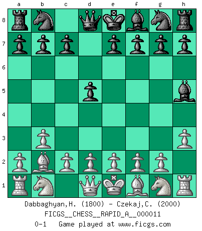 Last move : 0-1 2007 March 6 12:43:49 [Event "FICGS__CHESS__RAPID_A__000011"] [Site "FICGS"] [Date "2007.01.27"] [Round "1"] [White "Dabbaghyan,Hossein"] [Black "Czekaj,Christophe"] [Result "0-1"] [WhiteElo "1800"] [BlackElo "2000"] 1.b3 d5 2.Bb2 Bg4 3.h3 Bh5 0-1 This chess game has been lost on time (started : 2007.01.27 2:41:15) Nimzovich-Larsen attack : Classical variation Player Black won this chess game. Follow this game move after move (download)After black's reply to 1.e4 with 1..e5, leaves him always trying to get into the game. (Howard Staunton) Das typische an einem Großmeister ist, daß er eine gewonnene Position schnell und schmerzlos gewinnt. (Irving Chernev) El Ajedrez era la lengua materna de Capablanca. (Reti) A chaque perte on perd un peu de soi. (Joël Lautier) The bottom line is always the bottom line. (Johann Piek)