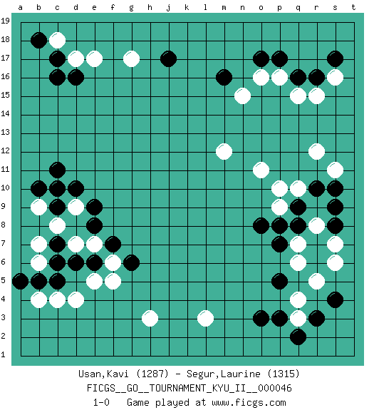 Last move : 1-0 2013 August 6 22:59:59 [Event "FICGS__GO__TOURNAMENT_KYU_II__000046"] [Site "FICGS"] [Date "2013.03.13"] [Round "1"] [Black "Usan,Kavi"] [White "Segur,Laurine"] [Result "1-0"] [Rating 1 "1287"] [Rating 2 "1315"] 1.q16 q4 2.c16 d4 3.j17 r8 4.d10 h3 5.c6 c8 6.e6 d7 7.d6 c10 8.c11 d9 9.b10 r12 10.c9 b9 11.c10 b7 12.e9 b6 13.c5 c4 14.b5 b4 15.a5 e7 16.f7 f6 17.e8 e5 18.g6 f5 19.c7 s16 20.o3 l3 21.r3 q3 22.q2 r5 23.p3 o16 24.o17 p16 25.p17 q15 26.r16 r15 27.s17 d17 28.c17 c18 29.d16 e17 30.b18 g17 31.m16 n15 32.r10 s11 33.s10 o11 34.q9 m12 35.q8 q7 36.p7 q6 37.o8 p10 38.p5 s6 39.s4 s7 40.s9 p9 41.p8 q10 42.s8 1-0 Here are the names of the openings (joseki) played in the four corners : Corner q16 : q16 r12 Hoshi (Hwajeom, Seongjeom, Xingwei`) 4-4 Point. The star or hoshi (4-4) point, emphasizing influence at the potential expense of territory. Player Black won this Go (weiqi, baduk) game. Follow this game move after move (download)The L-group is dead. (Anonymous) The worth of a book is to be measured by what you can carry away from it. (James Bryce)