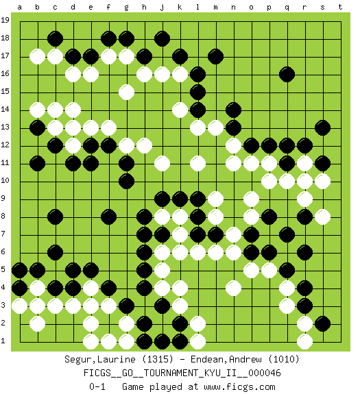 Last move : 0-1 2013 August 28 21:6:18 [Event "FICGS__GO__TOURNAMENT_KYU_II__000046"] [Site "FICGS"] [Date "2013.03.13"] [Round "1"] [Black "Segur,Laurine"] [White "Endean,Andrew"] [Result "0-1"] [Rating 1 "1315"] [Rating 2 "1010"] 1.d4 d16 2.q16 q4 3.r12 q10 4.m17 k16 5.c8 k4 6.c12 c14 7.g3 n4 8.r10 r9 9.q11 p10 10.h17 f17 11.k17 h16 12.g18 g17 13.j18 j16 14.f18 g15 15.e17 e16 16.j3 k3 17.r8 s10 18.s11 r11 19.s13 r10 20.p12 p11 21.q12 n11 22.q7 o8 23.p6 n6 24.o7 n7 25.p8 o9 26.o6 o5 27.r6 s8 28.q5 p5 29.r4 q3 30.n14 m13 31.f8 e13 32.e11 g12 33.g10 j11 34.j9 k7 35.h7 j6 36.h6 j5 37.h5 l11 38.l9 m9 39.l8 m8 40.l7 l6 41.m7 m6 42.l15 k14 43.l16 c3 44.c4 d3 45.e3 e2 46.f2 e1 47.b3 b2 48.b5 a3 49.a4 b4 50.a5 b3 51.d17 c17 52.c18 b17 53.b13 b14 54.k2 l2 55.j1 l1 56.k1 c5 57.c6 e4 58.d5 f3 59.f4 e3 60.e5 g2 61.h2 g1 62.h4 j4 63.h1 f1 64.j7 k8 65.k9 j8 66.h8 k6 67.f12 f13 68.g11 h12 69.d13 d14 70.e12 c13 71.b11 d12 72.d11 d13 73.l14 l13 74.n13 n12 75.o12 o11 76.r3 r2 77.s2 r1 0-1 Here are the names of the openings (joseki) played in the four corners : Corner d16 : d16 c12 Hoshi (Hwajeom, Seongjeom, Xingwei`) 4-4 Point. The star or hoshi (4-4) point, emphasizing influence at the potential expense of territory. Player White won this Go (weiqi, baduk) game. Follow this game move after move (download)Very few good moves are played. (Pierre Audouard) The obstacle is the path. (Zen proverb)