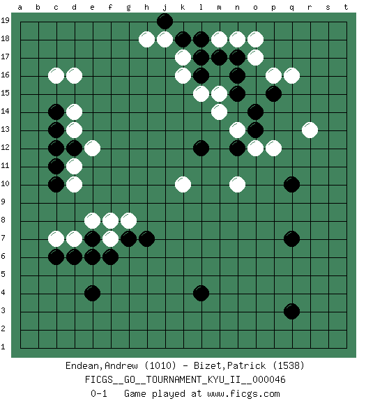 Last move : 0-1 2013 May 14 20:11:17 [Event "FICGS__GO__TOURNAMENT_KYU_II__000046"] [Site "FICGS"] [Date "2013.03.13"] [Round "1"] [Black "Endean,Andrew"] [White "Bizet,Patrick"] [Result "0-1"] [Rating 1 "1010"] [Rating 2 "1538"] 1.q3 q16 2.e4 d16 3.l4 k16 4.q10 d10 5.c14 c16 6.c11 d7 7.d6 c7 8.c6 f7 9.f6 d11 10.c10 d13 11.c13 d14 12.d12 e12 13.c12 k10 14.e7 e8 15.e6 g8 16.g7 f8 17.h7 r13 18.q7 n10 19.n16 o17 20.n17 o18 21.o14 p12 22.o13 o12 23.n12 m15 24.n15 m14 25.l17 k17 26.l16 l15 27.k18 m18 28.l18 j18 29.m17 n18 30.p15 p16 31.j19 h18 32.l12 n13 0-1 Here are the names of the openings (joseki) played in the four corners : Corner d16 : d16 c14 Hoshi (Hwajeom, Seongjeom, Xingwei`) 4-4 Point. The star or hoshi (4-4) point, emphasizing influence at the potential expense of territory. Ikken Kakari (Hankan Keolch'im, Yi Gua`jiao~, 1-Space Low Approach). Black 2 is the standard approach move to the 4-4. Corner d4 : e4 d7 Takamoku (Gomok, Gaomu`) 5-4 Point. The takamoku (high) point (5-4). With its emphasis on influence, the 5-4 point complements the 4-4 (hoshi) point in creating an influence-oriented fuseki. Player White won this Go (weiqi, baduk) game. Follow this game move after move (download)Go uses the most elemental materials and concepts - line and circle, wood and stone, black and white - combining them with simple rules to generate subtle strategies and complex tactics that stagger the imagination. (Iwamoto Kaoru, 9 dan professional Go player and former Honinbo title holder) As a goal marker shodan is important. As a destination it is a poor place to stop. (Thomas Tamayo)