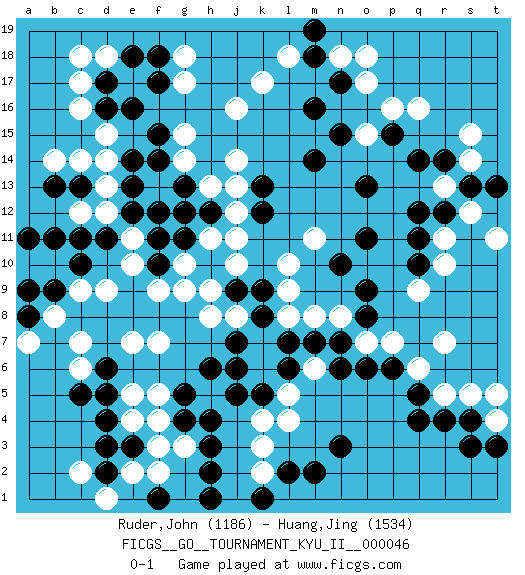Last move : 0-1 2013 October 12 4:1:21 [Event "FICGS__GO__TOURNAMENT_KYU_II__000046"] [Site "FICGS"] [Date "2013.03.13"] [Round "1"] [Black "Ruder,John"] [White "Huang,Jing"] [Result "0-1"] [Rating 1 "1186"] [Rating 2 "1534"] 1.d4 q16 2.q4 c16 3.e16 g17 4.d17 c17 5.e14 c14 6.e12 j16 7.m16 o17 8.m14 k17 9.m18 j14 10.k13 j13 11.k12 h11 12.o11 e10 13.c11 c9 14.f18 g18 15.f17 d18 16.e18 c18 17.g13 g15 18.h12 j12 19.g11 g10 20.h10 j11 21.f10 g9 22.f11 f9 23.f15 g14 24.d16 d15 25.c13 b14 26.b13 b10 27.b11 c6 28.c5 f3 29.d6 c7 30.h3 f5 31.e3 g3 32.h4 l4 33.h6 f7 34.g5 e5 35.d5 e2 36.d2 e4 37.d3 e7 38.n3 k3 39.h2 k6 40.j9 j8 41.k9 h9 42.j7 k7 43.k8 h8 44.g4 f4 45.k5 l5 46.j5 m6 47.l2 k2 48.m2 k4 49.f1 f2 50.h1 d1 51.k1 c2 52.o6 o7 53.n7 n8 54.m7 m8 55.l7 l8 56.n6 l10 57.l6 m11 58.o8 r7 59.r4 p7 60.o9 q9 61.q10 r10 62.q11 r11 63.r12 s12 64.s13 r13 65.q12 t11 66.q14 s14 67.r14 s15 68.t13 o15 69.o13 n18 70.n17 o18 71.n15 s5 72.s4 r5 73.p6 t4 74.t3 t5 75.s3 q6 76.q5 l18 77.m19 j10 78.n10 l9 79.j6 f13 80.f14 h13 81.g12 e11 82.f12 d12 83.e13 d13 84.d11 d14 85.c10 d9 86.b9 a10 87.a11 b8 88.a8 a7 89.a9 c12 90.p15 p16 0-1 This go game has been lost on time (started : 2013.03.13 18:19:43) Here are the names of the openings (joseki) played in the four corners : Corner d16 : c16 e16 Komoku (Somok, Xiao~mu`) 3-4 Point. The komoku (3-4) point is the traditional corner enclosure move.. Ikken Takagakari (Hankan Nop'dakeolch'im, Yi Gaogua`jiao~, 1-Space High Approach). The 5-4 approach move has become more popular in modern times, as modern Go emphasizes speed and influence. Corner q16 : q16 m16 Hoshi (Hwajeom, Seongjeom, Xingwei`) 4-4 Point. The star or hoshi (4-4) point, emphasizing influence at the potential expense of territory. Corner d4 : d4 c9 Hoshi (Hwajeom, Seongjeom, Xingwei`) 4-4 Point. The star or hoshi (4-4) point, emphasizing influence at the potential expense of territory. Corner q4 : q4 l4 Hoshi (Hwajeom, Seongjeom, Xingwei`) 4-4 Point. The star or hoshi (4-4) point, emphasizing influence at the potential expense of territory. Player White won this Go (weiqi, baduk) game. Follow this game move after move (download)Error is one of the sources of transformation. (Pierre Audouard) When the going gets tactical, the computers get going. (Hyatt)