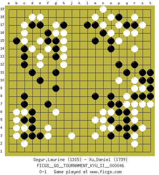Last move : 0-1 2013 June 9 16:37:47 [Event "FICGS__GO__TOURNAMENT_KYU_II__000046"] [Site "FICGS"] [Date "2013.03.13"] [Round "1"] [Black "Segur,Laurine"] [White "Xu,Daniel"] [Result "0-1"] [Rating 1 "1315"] [Rating 2 "1739"] 1.d4 q16 2.q4 c16 3.c8 f3 4.c12 j3 5.r8 m3 6.e3 f4 7.e17 d18 8.d17 c17 9.r12 r14 10.h17 r10 11.s10 s9 12.s11 r9 13.p12 p10 14.o14 o16 15.l17 n17 16.o3 r6 17.q6 r5 18.q5 r7 19.s8 q8 20.t9 s7 21.t8 t10 22.t11 t7 23.t10 q7 24.q11 r3 25.q3 r2 26.r4 s4 27.p7 o6 28.p6 m5 29.o5 c6 30.d6 c4 31.c5 b5 32.d5 b3 33.c3 b4 34.c7 c2 35.d3 b6 36.b15 c15 37.c14 d14 38.c13 e15 39.r17 r16 40.p18 r18 41.q17 s17 42.n18 m18 43.m17 o18 44.p16 p15 45.o15 p17 46.n16 n19 47.m15 h15 48.f7 e12 49.e10 n5 50.o8 g6 51.g9 o4 52.p4 n4 53.o7 n6 54.m8 g17 55.f16 g16 56.f15 e18 57.e14 f14 58.g14 e13 59.g15 h16 60.d11 h13 61.g13 h14 62.g11 h12 0-1 Here are the names of the openings (joseki) played in the four corners : Corner d16 : c16 c12 Komoku (Somok, Xiao~mu`) 3-4 Point. The komoku (3-4) point is the traditional corner enclosure move.. Corner q16 : q16 r12 Hoshi (Hwajeom, Seongjeom, Xingwei`) 4-4 Point. The star or hoshi (4-4) point, emphasizing influence at the potential expense of territory. Player White won this Go (weiqi, baduk) game. Follow this game move after move (download)The enemy's vital point is your own. (Anonymous) Faith : not wanting to know what is true. (Friedrich Nietzsche)