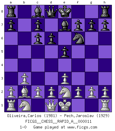 Last move : 1-0 2007 February 18 14:6:10 [Event "FICGS__CHESS__RAPID_A__000011"] [Site "FICGS"] [Date "2007.01.27"] [Round "1"] [White "Oliveira,Carlos"] [Black "Pech,Jaroslav"] [Result "1-0"] [WhiteElo "1981"] [BlackElo "1929"] 1.b3 e5 2.Bb2 Nc6 3.e3 Nf6 4.Bb5 d6 5.Bxc6+ bxc6 6.Ne2 Be7 1-0 Nimzovich-Larsen attack : Modern variation Player White won this chess game. Follow this game move after move (download)Chess opens and enriches your mind. (Saudin Robovic) Ich hatte Angst gegen einen russischen Großmeister zu verlieren, und er befürchtete gegen einen kleinen Jungen zu verlieren. (über ein Remis gegen Juri Awerbach). (Robert James Fischer) El juego del Ajedrez no es solamente una diversión quieta; algunas cualidades muy valuables de la mente se pueden adquirir y cultivar con el, como convertirlos en habitos disponibles para toda ocasión; ya que la vida es algo así como el Ajedrez. (Benjamin Franklin) Horreur, mais aussi harmonie suprême : qu'y avait-il en effet au monde en dehors des échecs ? Le brouillard, l'inconnu, le non-être... (Vladimir Nabokov) Perception is reality. (Immanuel Kant)