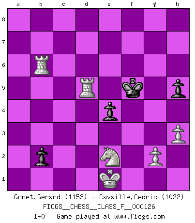 Last move : 1-0 2013 March 18 17:35:33 [Event "FICGS__CHESS__CLASS_F__000126"] [Site "FICGS"] [Date "2013.03.16"] [Round "1"] [White "Gonet,Gerard"] [Black "Cavaille,Cedric"] [Result "1-0"] [WhiteElo "1153"] [BlackElo "1022"] 1.d4 d5 2.e4 dxe4 3.Nc3 f5 4.f3 exf3 5.Qxf3 e6 6.Be3 Nc6 7.O-O-O Bd7 8.Bd3 Qe7 9.d5 exd5 10.Nxd5 Qf7 11.Nxc7+ Kd8 12.Nxa8 Qxa2 13.c3 Qa1+ 14.Kd2 Qxb2+ 15.Bc2 Be6 16.Ke1 Ke7 17.Bc5+ Kf7 18.Bxf8 Qxc2 19.Nc7 Qe4+ 20.Qxe4 fxe4 21.Nxe6 Kxe6 22.Bxg7 a5 23.Bxh8 Nf6 24.Bxf6 Kxf6 25.Ne2 b5 26.Ng3 b4 27.cxb4 axb4 28.Rf1+ Ke5 29.Rf5+ Ke6 30.Rc5 b3 31.Rxc6+ Ke5 32.Ne2 h5 33.Rb6 Kf5 34.h3 b2 35.Rd5+ 1-0 Blackmar gambit Queenside Castling by player White (move 7) 10 pieces endgame at move 31 : White KRRNPP , Black KPPP WHITE : King + 2 Rooks 1 Knight 2 Pawns BLACK : King + 3 Pawns Player White won this chess game. Follow this game move after move (download)There are tough players and nice guys, and I'm a tough player. (Bobby Fischer) Habe Mut, dich deines eigenen Verstandes zu bedienen. (Immanuel Kant) Una mala movida nulifica cuarenta buenas. (Horowitz) Les échecs, c'est l'art d'analyser. (Mikhail Botvinnik) Memory is a crazy woman that hoards colored rags and throws away food. (Austin O'Malley)