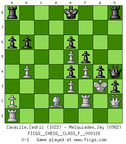 Last move : 0-1 2013 March 23 22:21:8 [Event "FICGS__CHESS__CLASS_F__000126"] [Site "FICGS"] [Date "2013.03.16"] [Round "1"] [White "Cavaille,Cedric"] [Black "Melquiades,Jay"] [Result "0-1"] [WhiteElo "1022"] [BlackElo "0982"] 1.d4 d5 2.Nc3 a6 3.Nf3 Bg4 4.e3 Nf6 5.Be2 Ne4 6.Bd2 e6 7.O-O h5 8.Ne1 Bxe2 9.Qxe2 f5 10.Nf3 g5 11.Ne5 Bg7 12.b4 Bxe5 13.dxe5 Nc6 14.Nxe4 dxe4 15.f4 g4 16.h4 Ne7 17.c4 Ng6 18.g3 Nxh4 19.gxh4 Qxh4 20.Qh2 Qe7 21.c5 b6 22.cxb6 cxb6 23.Rf2 h4 24.Kg2 h3+ 25.Kg3 Qh4+ 0-1 Queen's pawn : Chigorin variation Kingside Castling by player White (move 7) Player Black won this chess game. Follow this game move after move (download)When your house is on fire, you can't be bothered with the neighbors. Or, as we say in Chess, if your King is under attack you don't worry about losing a Pawn on the Queen's side. (Gary Kasparov) Kritik überlasse ich den Spießern. Ich zeige nichts, wofür ich mich schämen muss. (Alexandra Kosteniuk) El Ajedrez expande y enriquece tu mente. (Saudin Robovic) Toute estimation doit être constamment réévaluée. (Jacob Estrin) If we don't succeed, we run the risk of failure. (George W. Bush)