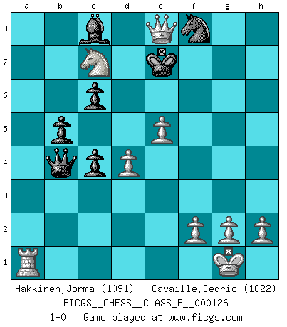Last move : 1-0 2013 March 17 16:54:15 [Event "FICGS__CHESS__CLASS_F__000126"] [Site "FICGS"] [Date "2013.03.16"] [Round "1"] [White "Hakkinen,Jorma"] [Black "Cavaille,Cedric"] [Result "1-0"] [WhiteElo "1091"] [BlackElo "1022"] 1.d4 d5 2.c4 dxc4 3.Nc3 c6 4.Nf3 a6 5.Bf4 b5 6.e4 e6 7.a3 Bd6 8.Bxd6 Qxd6 9.Be2 Ne7 10.O-O O-O 11.e5 Qc7 12.b4 a5 13.Qc2 axb4 14.axb4 Rxa1 15.Rxa1 Bb7 16.Ng5 Ng6 17.Bh5 Qe7 18.Bxg6 hxg6 19.Nce4 Qxb4 20.Nd6 Bc8 21.Ndxf7 Nd7 22.Qxg6 Rxf7 23.Qxf7+ Kh8 24.Qh5+ Kg8 25.Qh7+ Kf8 26.Qh8+ Ke7 27.Qxg7+ Kd8 28.Nxe6+ Ke8 29.Nc7+ Kd8 30.Ne6+ Ke8 31.Qg6+ Ke7 32.Nc7 Nf8 33.Qe8+ 1-0 Queen's gambit accepted Kingside Castling by player White (move 10) Kingside Castling by player Black (move 10) Player White won this chess game. Follow this game move after move (download)It is no time to be playing Chess when the house is on fire. (Italian Proverb) Schach ist ein schwarz-weisser Dschungel. (Garry Kasparov) ¿Cual es el objetivo de jugar una apertura de gambito?... Para adquirir una reputación de ser un jugador apuesto a costo de perder el juego. (Siegbert Tarrasch) Les Echecs, c'est l'art de la guerre sans les charniers, c'est la résurrection des morts tombés au champ d'honneur, l'espoir perpétuel, la suprématie de l'intelligence sur la force, la culture de l'esprit. (F. Szpiner) Bobby never cared about money, though. His only desire was to prove that his choices were correct: He wanted chess to be important because he was a chess player, and he wanted to be important. Bobby knew money was important, but he didn't have a clue why, outside of clothes and status. The only way he could accomplish what he wanted was to fight for a lot of money. Once he got it, he gave it away. He did not know how to spend it. And once he'd become champion, after, essentially, sacrificing his life for it, he didn't know how to spend his time. (Bob Wade)
