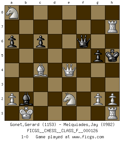 Last move : 1-0 2013 March 21 0:38:54 [Event "FICGS__CHESS__CLASS_F__000126"] [Site "FICGS"] [Date "2013.03.16"] [Round "1"] [White "Gonet,Gerard"] [Black "Melquiades,Jay"] [Result "1-0"] [WhiteElo "1153"] [BlackElo "0982"] 1.d4 d5 2.e4 e6 3.c4 dxe4 4.Nc3 f5 5.f3 a6 6.Be3 Bb4 7.Qc2 Ne7 8.O-O-O Nbc6 9.d5 exd5 10.cxd5 O-O 11.dxc6 Nd5 12.Nxd5 Bd6 13.Bc4 Be6 14.Ne2 bxc6 15.Ndf4 g5 16.Nxe6 Qe7 17.Nxc7 Kg7 18.Bd4+ Rf6 19.Bxf6+ Qxf6 20.Nxa8 Be5 21.Rd7+ Kh6 22.fxe4 fxe4 23.Qxe4 Bxb2+ 24.Kb1 Kh5 25.Rxh7+ 1-0 Blackmar gambit Queenside Castling by player White (move 8) Kingside Castling by player Black (move 10) Player White won this chess game. Follow this game move after move (download)A win by an unsound combination, however showy, fills me with artistic horror. (Wilhelm Steinitz) Der Umstand, daß uns eine 7 Stunden Zeitkontrolle ermöglicht eine großartige, tiefe Partie zu spielen, ist für die Massenmedien nicht weiter von Bedeutung. (Alexej Shirov) Prefiero perder una partida realmente buena, que ganar una mala. (David Levy) A ce moment-là, je menaçais de comprendre la position ! (Clément L'Heureux) Wawaweewa ! (Borat: Cultural learnings of America for make benefit glorious nation of Kazakhstan)