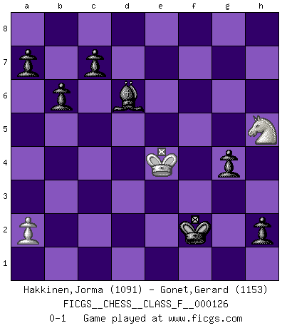 Last move : 0-1 2013 March 24 19:10:53 [Event "FICGS__CHESS__CLASS_F__000126"] [Site "FICGS"] [Date "2013.03.16"] [Round "1"] [White "Hakkinen,Jorma"] [Black "Gonet,Gerard"] [Result "0-1"] [WhiteElo "1091"] [BlackElo "1153"] 1.d4 Nf6 2.c4 g6 3.Nf3 Bg7 4.Nc3 O-O 5.Bg5 d6 6.e3 Nc6 7.Be2 e5 8.dxe5 dxe5 9.O-O Bf5 10.Bxf6 Bxf6 11.Rc1 e4 12.Qxd8 Raxd8 13.Ne1 Rd2 14.Nd5 Be5 15.Rc2 Rxc2 16.Nxc2 Rb8 17.b3 Kg7 18.g3 Bd6 19.b4 Ne7 20.Nxe7 Bxe7 21.Nd4 Bh3 22.Rd1 Bxb4 23.Bf1 Bg4 24.Rb1 Bd6 25.h3 Bd7 26.Bg2 f5 27.g4 fxg4 28.hxg4 Bxg4 29.f3 exf3 30.Bxf3 Bxf3 31.Nxf3 Bc5 32.Kf2 b6 33.Ne5 Re8 34.Ng4 h5 35.Nh2 Bxe3+ 36.Kf3 Bc5 37.Rd1 Bd6 38.Nf1 g5 39.Nd2 h4 40.Kg4 Kg6 41.c5 Bxc5 42.Nb3 Re4+ 43.Kf3 Rf4+ 44.Ke2 Bd6 45.Nd4 g4 46.Rh1 Kh5 47.Ke3 h3 48.Ne6 Rf3+ 49.Ke4 Kh4 50.Ng7 Kg3 51.Nh5+ Kg2 52.Rb1 h2 53.Rb2+ Rf2 54.Rxf2+ Kxf2 0-1 King's Indian, 3.Nf3 Kingside Castling by player Black (move 4) Kingside Castling by player White (move 9) 10 pieces endgame at move 54 : White KNP , Black KBPPPPP WHITE : King + 1 Knight 1 Pawn BLACK : King + 1 Bishop 5 Pawns Player Black won this chess game. Follow this game move after move (download)For surely of all the drugs in the world, Chess must be the most permanently pleasurable. (Assiac) Gewinnen beim Schach fördert das Selbstvertrauen. Beim Sex spüre ich sowas nicht... (Garry Kasparov) El Ajedrez es como la guerra en un tablero. (Bobby Fischer) Les erreurs sont comme les malheurs, elles n'arrivent jamais seules. (Siegbert Tarrasch) After growing wildly for years, the field of computing appears to be reaching its infancy. (John Pierce)