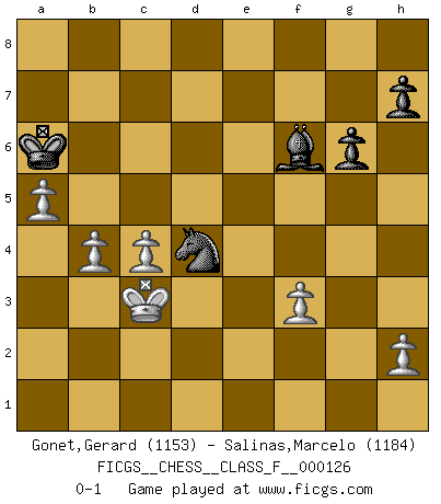 Last move : 0-1 2013 August 30 14:53:27 [Event "FICGS__CHESS__CLASS_F__000126"] [Site "FICGS"] [Date "2013.03.16"] [Round "1"] [White "Gonet,Gerard"] [Black "Salinas,Marcelo"] [Result "0-1"] [WhiteElo "1153"] [BlackElo "1184"] 1.d4 d5 2.e4 dxe4 3.Nc3 Nf6 4.f3 exf3 5.Qxf3 Qxd4 6.Be3 Qb4 7.O-O-O Bg4 8.Nb5 Na6 9.Qxb7 Rd8 10.Rxd8+ Kxd8 11.Bd2 Bc8 12.Bxb4 Bxb7 13.Nxa7 Nxb4 14.Kb1 Ne4 15.Nf3 e6 16.Bb5 c6 17.Rd1+ Nd6 18.Ne5 Kc7 19.Ba4 Nd5 20.Bxc6 f6 21.Nb5+ Kb6 22.Bxb7 fxe5 23.Bxd5 Nxb5 24.Bxe6 Nd4 25.Bd5 Bc5 26.c3 Nf5 27.Be4 g6 28.b4 Be7 29.Rd5 Rd8 30.Rxe5 Rd1+ 31.Kb2 Re1 32.Re6+ Kc7 33.Rc6+ Kd7 34.Bf3 Rf1 35.a4 Rxf3 36.gxf3 Kxc6 37.Kb3 Kb6 38.c4 Nd4+ 39.Kc3 Bf6 40.a5+ Ka6 0-1 Blackmar gambit Queenside Castling by player White (move 7) Player Black won this chess game. Follow this game move after move (download)He who fears an isolated Queen's Pawn should give up Chess. (Siegbert Tarrasch) Ja, ich habe einmal eine Blitzpartie gespielt, es war in einem Zug, 1929. --im Interview 1989 (Mikhail Moiseyevich Botvinik) Yo no creo en la psicología. Yo creo en las buenas movidas. (Bobby Fischer) Echiquier : carré parfait, comme la Jérusalem nouvelle décrite par l'auteur de l'Apocalypse, huit cases sur huit, exaltation du chiffre 4, symbole du cosmos aux quatre horizons... où le noir et le blanc, l'ombre et la lumière, le mal et le bien s'entremêlent et se conjuguent. (Robert Couffignal, Le Gambit du poète) History is the quarrels of popes and kings, with wars or pestilences in every page; the men all so good for nothing, and hardly any women at all. (Jane Austen)