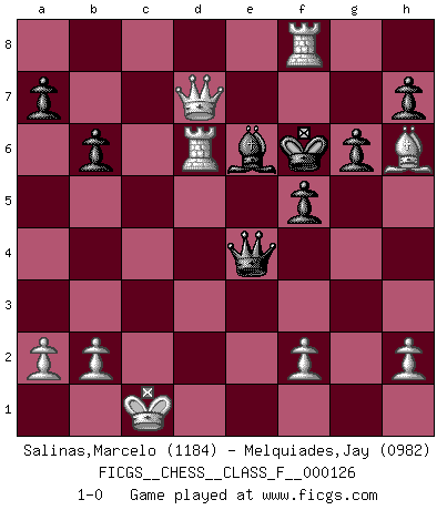 Last move : 1-0 2013 July 9 15:16:33 [Event "FICGS__CHESS__CLASS_F__000126"] [Site "FICGS"] [Date "2013.03.16"] [Round "1"] [White "Salinas,Marcelo"] [Black "Melquiades,Jay"] [Result "1-0"] [WhiteElo "1184"] [BlackElo "0982"] 1.Na3 e5 2.e4 d5 3.exd5 Qxd5 4.Bc4 Qxg2 5.Qh5 g6 6.Qxe5+ Ne7 7.Bd5 Qg4 8.Qxh8 Nxd5 9.Qe5+ Be6 10.Ne2 Nd7 11.Qg3 Nc5 12.Nb5 Bd6 13.Nxd6+ cxd6 14.Qxd6 Rd8 15.Qxc5 b6 16.Qb5+ Kf8 17.d3 Bf5 18.c4 Bxd3 19.Bh6+ Kg8 20.O-O-O Qxe2 21.Rd2 Qe4 22.Rhd1 Bxc4 23.Rxd5 f5 24.Rxd8+ Kf7 25.Qd7+ Kf6 26.Rd6+ Be6 27.Rf8+ 1-0 Durkin's attack Queenside Castling by player White (move 20) Player White won this chess game. Follow this game move after move (download)It is peculiar but a fact nevertheless, that gamblers in chess always have enthusiastic followers. (Botvinnik) Es ist nicht das erste mal, dass sich die FIDE dem Arabischen Geld gebeugt hat (über die FIDE WM 2004 in Lybien). (Larry Evans) Te sientas frente a un tablero y repentinamente tu corazón brinca. Tu mano tiembla al tomar una pieza y moverla. Pero lo que el Ajedrez te enseña es que tu debes permanecer ahí con calma y pensar de que si realmente es una buena idea o de que si hay otras ideas mejores. (Stanley Kubrick) Nous vivons dans un monde échiquéen : chaque jour qui passe est un défi à relever. (Philosophe Sasha) Wisdom is the reward you get for a lifetime of listening when you'd have preferred to talk. (Doug Larson)