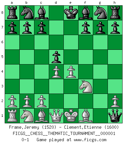 Last move : 0-1 2006 May 21 19:18:3 [Event "FICGS__CHESS__THEMATIC_TOURNAMENT__000001"] [Site "FICGS"] [Date "2006.05.19"] [Round "1"] [White "Frame,Jeremy"] [Black "Clement,Etienne"] [Result "0-1"] [WhiteElo "1520"] [BlackElo "1600"] 1.e4 e5 2.f4 exf4 3.d4 Qh4+ 4.g3 fxg3 5.Nf3 g2+ 6.Nxh4 gxh1=Q 7.Nf3 d5 0-1 KGA : Villemson (Steinitz) gambit Promotion Queen by player Black (move 6) Player Black won this chess game. Follow this game move after move (download)You must take your opponent into a deep dark forest where 2+2=5, and the path leading out is only wide enough for one. (Mikhail Tal) Ich tröste mich mit dem Vergnügen, daß Schachfans, Zuschauer und Leser glücklich sind, wenn ein Großmeister etwas riskiert, statt nur Klötzchen zu schieben. (Mikhail Nekhemyevich Tal) Muchos se han convertido en Maestros de Ajedrez, nadie se ha convertido en el Maestro del Ajedrez. (Siegbert Tarrasch) Il n'y a pas de prix trop élevé au scalp de l'ennemi. (Koblentz) Creativity is allowing yourself to make mistakes. Art is knowing which ones to keep. (Scott Adams)