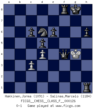Last move : 0-1 2013 September 5 20:0:19 [Event "FICGS__CHESS__CLASS_F__000126"] [Site "FICGS"] [Date "2013.03.16"] [Round "1"] [White "Hakkinen,Jorma"] [Black "Salinas,Marcelo"] [Result "0-1"] [WhiteElo "1091"] [BlackElo "1184"] 1.d4 e6 2.c4 Bb4+ 3.Nc3 Nc6 4.Nf3 d5 5.c5 Nf6 6.Bg5 Bxc3+ 7.bxc3 h6 8.Bh4 g5 9.Bg3 Ne4 10.Qc2 g4 11.Nd2 f5 12.e3 Na5 13.Bd3 Nxd2 14.Kxd2 c6 15.Rhb1 b5 16.cxb6 axb6 17.Rb2 Ba6 18.Rxb6 Bxd3 19.Qxd3 Qxb6 20.Rb1 Qd8 21.Be5 O-O 22.h3 Qh4 23.Rf1 Nc4+ 24.Kc2 Na3+ 25.Kd2 Nc4+ 26.Ke2 Rxa2+ 27.Ke1 gxh3 28.gxh3 Qxh3 29.Bg3 Ra1+ 30.Ke2 Qxf1+ 31.Kf3 Qxd3 32.Bd6 Nxd6 33.Kf4 Qe4+ 34.Kg3 f4+ 35.exf4 Qxf4+ 36.Kg2 Qxf2+ 37.Kh3 Rh1+ 38.Kg4 Qf4+ 0-1 Queen's pawn : Franco-Indian (Keres) defense Kingside Castling by player Black (move 21) Player Black won this chess game. Follow this game move after move (download)A Chess game is divided into three stages: the first, when you hope you have the advantage, the second when you believe you have an advantage, and the third... when you know you're going to lose ! (Savielly Tartakower) Offener Brief an US-Präsident Bush anlässlich der Verhaftung Bobby Fishers: Verhaften Sie mich. Stecken Sie mich in dieselbe Zelle wie Bobby Fisher und geben Sie uns ein Schachspiel mit. (Boris Vassilievich Spassky) Morphy probablemente fue el genio más grande de todos. (Bobby Fischer) Pour se monter efficace, un Cavalier a besoin d'avant-postes ! Les Cavaliers font les meilleurs bloqueurs de pions passés. It's unlucky to be superstitious. (Dave Enteles)