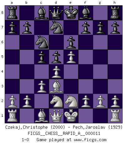 Last move : 1-0 2007 February 19 13:15:0 [Event "FICGS__CHESS__RAPID_A__000011"] [Site "FICGS"] [Date "2007.01.27"] [Round "1"] [White "Czekaj,Christophe"] [Black "Pech,Jaroslav"] [Result "1-0"] [WhiteElo "2000"] [BlackElo "1929"] 1.e4 e6 2.d4 d5 3.Nd2 Nf6 4.e5 Nfd7 5.Bd3 c5 6.c3 Nc6 7.Ne2 1-0 French : Tarrasch, Closed variation Player White won this chess game. Follow this game move after move (download)Those who say they understand Chess, understand nothing. (Robert Hubner) Herr Iljumschinow ist ein etwas merkwürdiger Geschäftsmann: Er arbeitet zusammen mit Leuten wie Muammar al-Gaddafi; früher ist das Saddam Hussein gewesen. (Joel Lautier) Uno no tiene que jugar muy bien, es suficiente jugar mejor que el oponente. (Siegbert Tarrasch) Roi des jeux et jeu des rois, les échecs portent en eux un sentiment d'infini. Ils donnent à celui qui s'est efforcé d'en approfondir les arcanes l'impression de n'être pas à la mesure de l'homme; en fait, ils constituent un résumé de l'univers, un microcosme, et figurent cette grande échelle qui, dans les plans de la lumière descend jusqu'à la matière, qui des abîmes insondables remonte jusqu'en l'infini de Dieu. (Pyrame) I've never seen so many men wasted so badly. (Blondie in The Good, The Bad and The Ugly)