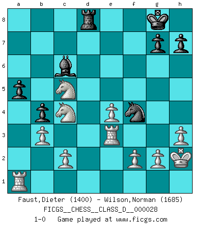 Last move : 1-0 2007 February 24 8:40:2 [Event "FICGS__CHESS__CLASS_D__000028"] [Site "FICGS"] [Date "2007.01.27"] [Round "1"] [White "Faust,Dieter"] [Black "Wilson,Norman"] [Result "1-0"] [WhiteElo "1400"] [BlackElo "1685"] 1.e4 e5 2.Nf3 Nc6 3.Bb5 a6 4.Bxc6 dxc6 5.O-O f6 6.d4 Bg4 7.dxe5 Qxd1 8.Rxd1 fxe5 9.Rd3 Bd6 10.Nbd2 b5 11.b3 Ne7 12.a4 O-O 13.Bb2 Ng6 14.h3 Bc8 15.axb5 cxb5 16.Ba3 Bxa3 17.Rxa3 Nf4 18.Re3 c5 19.Nxe5 Bb7 20.Nd7 Rfd8 21.Nxc5 Bc6 22.Nf3 a5 23.Kh2 Rd2 24.Nxd2 b4 25.Ra1 Rd8 26.Nc4 1-0 Ruy Lopez : Exchange, Gligoric variation Kingside Castling by player White (move 5) Kingside Castling by player Black (move 12) Player White won this chess game. Follow this game move after move (download)Mistrust is the most necessary characteristic of the Chess player. (Siegbert Tarrasch) Irgendwie scheint mir sonntags früh um 9 Uhr der Killerinstinkt verloren gegangen zu sein. (Alexej Shirov) Cada Peón es una Reina en potencia. (James Mason) Les pièces de l'échiquier étaient impitoyables. Elles le retenaient, elles l'absorbaient. Il y avait de l'horreur en cela, mais aussi une harmonie unique. Car, qu'y a-t-il dans le monde, à part les échecs ? (V. Nabokov) Better than a thousand days of diligent study is one day with a great teacher. (Japanese proverb)