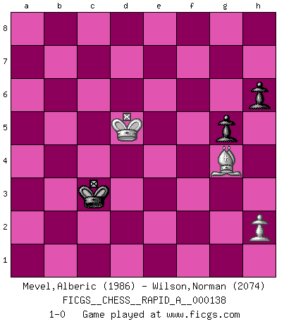 Last move : 1-0 2013 July 16 10:12:2 [Event "FICGS__CHESS__RAPID_A__000138"] [Site "FICGS"] [Date "2013.03.17"] [Round "1"] [White "Mevel,Alberic"] [Black "Wilson,Norman"] [Result "1-0"] [WhiteElo "1986"] [BlackElo "2074"] 1.e4 c5 2.Nf3 d6 3.d4 cxd4 4.Nxd4 Nf6 5.Nc3 a6 6.Bg5 e6 7.f4 Be7 8.Qf3 Qc7 9.O-O-O Nbd7 10.g4 b5 11.Bxf6 Nxf6 12.g5 Nd7 13.f5 Bxg5+ 14.Kb1 O-O 15.fxe6 Nb6 16.Nd5 Nxd5 17.exd5 fxe6 18.Qg4 e5 19.Qxg5 exd4 20.Bd3 g6 21.Rhf1 Qg7 22.Rxf8+ Qxf8 23.Rf1 Qe8 24.Qh4 Ra7 25.a4 bxa4 26.Qxd4 Rb7 27.Ka2 a5 28.Qh4 Qe7 29.Qxa4 Bh3 30.Rf2 Rb4 31.Qxa5 Rb8 32.Qa3 Qe5 33.Re2 Qg7 34.Re1 Bg2 35.c4 Bh3 36.Qc3 Qxc3 37.bxc3 Kf7 38.Rb1 Ra8+ 39.Kb3 Kf6 40.Re1 Bd7 41.Rf1+ Ke5 42.Rf7 Ra7 43.Kb2 Rb7+ 44.Kc1 Bc8 45.Rxb7 Bxb7 46.Kb2 Kf4 47.Kb3 Ke3 48.Bb1 Kd2 49.Be4 Ke3 50.Bc2 Bc8 51.c5 dxc5 52.Kc4 Kd2 53.Ba4 g5 54.Be8 h6 55.Bf7 Ba6+ 56.Kxc5 Kxc3 57.Be6 Bc4 58.Bg4 Bxd5 59.Kxd5 1-0 Sicilian : Najdorf, 7...Be7 Queenside Castling by player White (move 9) Kingside Castling by player Black (move 14) 10 pieces endgame at move 51 : White KBPPP , Black KBPPP WHITE : King + 1 Bishop 3 Pawns BLACK : King + 1 Bishop 3 Pawns 9 pieces endgame at move 56 : White KBPPP , Black KBPP WHITE : King + 1 Bishop 3 Pawns BLACK : King + 1 Bishop 2 Pawns 8 pieces endgame at move 56 : White KBPP , Black KBPP WHITE : King + 1 Bishop 2 Pawns BLACK : King + 1 Bishop 2 Pawns 7 pieces endgame at move 58 : White KBP , Black KBPP WHITE : King + 1 Bishop 1 Pawn BLACK : King + 1 Bishop 2 Pawns 6 pieces endgame at move 59 : White KBP , Black KPP WHITE : King + 1 Bishop 1 Pawn BLACK : King + 2 Pawns Player White won this chess game. Follow this game move after move (download)Chess is no whit inferior to the violin, and we have a large number of professional violinists. (Mikhail Botvinnik) Das Schachspiel übertrifft alle anderen Spiele so weit wie der Chimborasso einen Misthaufen. (Arthur Schopenhauer) No volvere nunca a jugar contigo. Has insultado a mi amigo. - cuando un oponente se maldijo por una mala jugada (Miguel Najdorf) Lorsque vous vous retrouvez devant une position atroce, ne tendez pas un ultime piège dérisoire avec l'intention d'abandonner si l'adversaire le déjoue ! Faites-vous plutôt un devoir de résister comme si votre vie en dépendait. Jouez le coup qui vous déplairait au centuple si vous étiez dans la peau de votre tortionnaire ! Is not life a hundred times too short to bore ourselves ? (Friedrich Nietzsche)