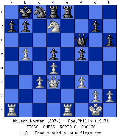Last move : 1-0 2013 April 29 5:16:17 [Event "FICGS__CHESS__RAPID_A__000138"] [Site "FICGS"] [Date "2013.03.17"] [Round "1"] [White "Wilson,Norman"] [Black "Roe,Philip"] [Result "1-0"] [WhiteElo "2074"] [BlackElo "1917"] 1.e4 c6 2.d4 d5 3.e5 Bf5 4.Nf3 e6 5.Be2 Nd7 6.O-O h6 7.c3 Qc7 8.Be3 O-O-O 9.Nbd2 f6 10.Bf4 fxe5 11.Nxe5 Bd6 12.Ndf3 Ngf6 13.Bg3 Rhf8 14.Bd3 Nh5 15.Nxd7 Qxd7 16.Bxf5 exf5 17.Bxd6 Qxd6 18.Re1 Nf6 19.Qd3 Ne4 20.Ne5 Qf6 21.b4 Rfe8 22.a4 Kb8 23.f3 Nd6 24.b5 cxb5 25.axb5 Nc8 26.Nd7+ 1-0 Caro-Kann : Advance variation Kingside Castling by player White (move 6) Queenside Castling by player Black (move 8) Player White won this chess game. Follow this game move after move (download)The game of Chess is not merely an idle amusement; several very valuable qualities of the mind are to be acquired and strengthened by it, so as to become habits ready on all occasions; for life is a kind of Chess. (Benjamin Franklin) Ich bin stolz ein Bulgare zu sein. (Veselin Topalov) Entre mas años cumplo, mas valoro los Peones. (Keres) Psychologiquement, tu dois avoir confiance en toi même, mais cette confiance doit être basée sur des faits. (Robert Fischer) Excelling at chess has long been considered a symbol of more general intelligence. That is an incorrect assumption in my view, as pleasant as it might be. But for the purposes of argument and investigation, chess is, in Russkin-Gutman's words, 'an unparalleled laboratory, since both the learning process and the degree of ability obtained can be objectified and quantified, providing an excellent comparative framework on which to use rigorous analytical techniques.' (The Chess Master and the Computer, by Garry Kasparov - 2010)