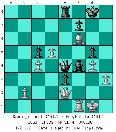 Last move : 1/2-1/2 2013 July 21 22:44:3 [Event "FICGS__CHESS__RAPID_A__000138"] [Site "FICGS"] [Date "2013.03.17"] [Round "1"] [White "Domingo,Jordi"] [Black "Roe,Philip"] [Result "1/2-1/2"] [WhiteElo "1917"] [BlackElo "1917"] 1.e4 e5 2.Nf3 Nc6 3.Bc4 Nf6 4.Ng5 d5 5.exd5 Na5 6.d3 h6 7.Nf3 Nxc4 8.dxc4 e4 9.Nd4 Bg4 10.Qd2 Bd6 11.h3 Bd7 12.Qe2 O-O 13.Be3 c6 14.dxc6 bxc6 15.Nb3 a5 16.a4 Re8 17.Nc3 Be5 18.Bd2 Qe7 19.O-O Bc7 20.f4 e3 21.Be1 Rad8 22.Rd1 g5 23.Rd4 Bc8 24.fxg5 hxg5 25.Rxd8 Bxd8 26.Nd4 Bc7 27.g4 Bf4 28.Qf3 c5 29.Nde2 Bb7 30.Nd5 Nxd5 31.cxd5 Ba6 32.Bxa5 Bxe2 33.Qxe2 Qa7 34.Bc3 Qxa4 35.Bf6 Qe4 36.c4 1/2-1/2 Two knights defense : Kieseritsky variation Kingside Castling by player Black (move 12) Kingside Castling by player White (move 19) This chess game ended in a draw. Follow this game move after move (download)Chess is a terrible game. If you have no center, your opponent has a freer position. If you do have a center, then you really have something to worry about ! (Siegbert Tarrasch) Wie ich sie so einen nach dem anderen nieder mähte wurde meine Überlegenheit offensichtlich. (José Raúl Capablanca) Con el tiempo, empecé a progresar en partidas decisivas. Tal vez porque me di cuenta de una simple verdad: no solo estaba yo nervioso sino también mi oponente. (Mikhail Tal) Aux échecs, les retours au sommet sont rares : les dommages psychologiques consécutifs à une défaite sont trop sévères. (Daily Telegraph) They say in chess you've got to kill the queen, and then you mate it... Oh I, do you ? (Red Hot Chili Peppers, Fortune faded)