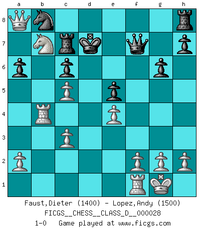 Last move : 1-0 2007 May 22 16:36:40 [Event "FICGS__CHESS__CLASS_D__000028"] [Site "FICGS"] [Date "2007.01.27"] [Round "1"] [White "Faust,Dieter"] [Black "Lopez,Andy"] [Result "1-0"] [WhiteElo "1400"] [BlackElo "1500"] 1.e4 e5 2.Nf3 Nc6 3.Bb5 a6 4.Bxc6 dxc6 5.O-O f6 6.d4 Bg4 7.c3 Qe7 8.dxe5 fxe5 9.Be3 g6 10.Nbd2 O-O-O 11.b4 Bh6 12.Qe2 Bxe3 13.Qxe3 Nf6 14.Qa7 Bxf3 15.Nxf3 Nd7 16.Nd2 c5 17.Nb3 c6 18.Na5 Nb8 19.bxc5 Qf7 20.Rab1 Rd7 21.Qa8 Rc7 22.Rb4 Kd7 23.Nxb7 1-0 Ruy Lopez : Exchange, Gligoric variation Kingside Castling by player White (move 5) Queenside Castling by player Black (move 10) Player White won this chess game. Follow this game move after move (download)You know, comrade Pachman, I don't enjoy being a Minister, I would rather play Chess like you. (Che Guevara) Wie, soll nun auch die Opposition abgeschafft werden? Ja, es tut mir leid, Ihnen diesen Schmerz nicht ersparen zu können. (Aaron Nimzowitsch) No hay precio que sea tan grande por la cabellera del Rey enemigo. (Koblentz) Le moment que je préfère le plus dans une rencontre, c'est celui où je sens que la personnalité de l'adversaire se brise. (Robert Fischer) The only difference between a tax man and a taxidermist is that the taxidermist leaves the skin. (Mark Twain)