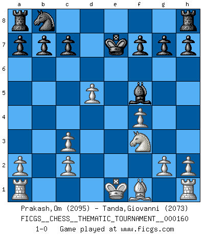 Last move : 1-0 2013 June 28 0:36:14 [Event "FICGS__CHESS__THEMATIC_TOURNAMENT__000160"] [Site "FICGS"] [Date "2013.03.17"] [Round "1"] [White "Prakash,Om"] [Black "Tanda,Giovanni"] [Result "1-0"] [WhiteElo "2095"] [BlackElo "2073"] 1.e4 e5 2.f4 d5 3.exd5 e4 4.d3 Nf6 5.dxe4 Nxe4 6.Nf3 Bc5 7.Qe2 Bf5 8.Nc3 Qe7 9.Be3 Bxe3 10.Qxe3 Nxc3 11.Qxe7+ Kxe7 12.bxc3 1-0 KGD : Falkbeer, Main line, 7...Bf5 Player White won this chess game. Follow this game move after move (download)It is the aim of the modern school, not to treat every position according to one general law, but according to the principle inherent in the position. (Richard Reti) Über Frauen: Chess is better. (Robert James Fischer) Repentinamente, me resultaba obvio en mi analisis que yo había pasado por alto lo que Fischer había visto en el tablero con la mas grande facilidad. (Mikhail Botvinnik) Psychologiquement, tu dois avoir confiance en toi même, mais cette confiance doit être basée sur des faits. (Robert Fischer) Ah, beer! The cause of, and the solution to, all of life's problems. (Homer Simpson)