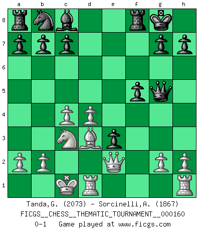 Last move : 0-1 2013 June 28 0:21:26 [Event "FICGS__CHESS__THEMATIC_TOURNAMENT__000160"] [Site "FICGS"] [Date "2013.03.17"] [Round "1"] [White "Tanda,Giovanni"] [Black "Sorcinelli,Andrea"] [Result "0-1"] [WhiteElo "2073"] [BlackElo "1867"] 1.e4 e5 2.f4 exf4 3.Nf3 Ne7 4.d4 d5 5.Nc3 dxe4 6.Nxe4 Nd5 7.Bd3 Be7 8.c4 Ne3 9.Qe2 O-O 10.Bxe3 fxe3 11.O-O-O f5 12.Nc3 Bg5 13.Nxg5 Qxg5 0-1 KGA : Bonsch-Osmolovsky variation Kingside Castling by player Black (move 9) Queenside Castling by player White (move 11) Player Black won this chess game. Follow this game move after move (download)Any material change in a position must come about by mate, a capture, or a Pawn promotion. (Purdy) Die jungen Leute sollen verstehen, dass sie noch etwas von mir lernen können und müssen. (Viktor Kortschnoi) ¿Esta Bobby Fischer algo cuerdo?. (Salo Flohr) Il vaut toujours mieux jouer un plan faux de façon logique que de n'avoir pas de plan du tout. (Victor Kortchnoï) Experience is the name we all give to our mistakes. (Oscar Wilde)