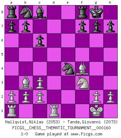 Last move : 1-0 2013 July 5 16:57:3 [Event "FICGS__CHESS__THEMATIC_TOURNAMENT__000160"] [Site "FICGS"] [Date "2013.03.17"] [Round "1"] [White "Hallqvist,Niklas"] [Black "Tanda,Giovanni"] [Result "1-0"] [WhiteElo "2053"] [BlackElo "2073"] 1.e4 e5 2.f4 exf4 3.Bc4 d5 4.Bxd5 Nf6 5.Nc3 Bb4 6.Nf3 O-O 7.O-O c6 8.Bb3 Bxc3 9.dxc3 Qxd1 10.Rxd1 Nxe4 11.Bxf4 1-0 KGA : Bishop's gambit, Morphy variation Kingside Castling by player Black (move 6) Kingside Castling by player White (move 7) Player White won this chess game. Follow this game move after move (download)The Pin is mightier than the sword. (Fred Reinfeld) Fischer ist das größte Genie, das je vom Schachhimmel heruntergestiegen ist. (Mikhail Nekhemyevich Tal) ¿Quién es tu oponente esta tarde? Esta tarde mi oponente son las piezas negras. (Akiba Rubinstein) En blitz, le Cavalier l'emporte sur le Fou. (Vlastimil Hort) CHESS, n. f. [echecs, Fr.] A nice and abstruse game, in which two sets of puppets are moved in opposition to each other. (Dr Samuel Johnson, A Dictionary Of The English Language, 1755)