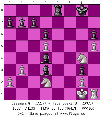 Last move : 0-1 2013 April 16 19:38:50 [Event "FICGS__CHESS__THEMATIC_TOURNAMENT__000160"] [Site "FICGS"] [Date "2013.03.17"] [Round "1"] [White "Uzzaman,Ashik"] [Black "Teverovski,Bogoljub"] [Result "0-1"] [WhiteElo "1527"] [BlackElo "2083"] 1.e4 e5 2.f4 exf4 3.Nf3 g5 4.h4 g4 5.Ne5 Nf6 6.d4 d6 7.Nd3 Nxe4 8.Bxf4 Bg7 9.c3 Qe7 10.Qe2 Nc6 11.Nd2 Nf6 12.O-O-O Qxe2 13.Bxe2 O-O 14.h5 Re8 15.Rde1 Bf5 16.Nf2 Nd5 17.Bg5 h6 18.Bh4 Nf4 19.Kd1 Nxe2 20.Rxe2 Bc2+ 21.Ke1 Rxe2+ 22.Kxe2 Re8+ 23.Kf1 f5 24.Bg3 Ne7 25.b3 Nd5 26.c4 f4 27.cxd5 fxg3 28.Nxg4 Bd3+ 29.Kg1 Bxd4+ 0-1 KGA : Kieseritsky, Berlin defense Queenside Castling by player White (move 12) Kingside Castling by player Black (move 13) Player Black won this chess game. Follow this game move after move (download)Without error there can be no brilliancy. (Emanuel Lasker) Ich kämpfe solange mein Gegner einen Fehler machen kann. (Emanuel Lasker) Puntos débiles o agujeros en la posición de tu oponente deben de ser ocupados por piezas, no Peones. (Siegbert Tarrasch) Des combinaisons [dans le jeu d'échecs] pareilles à des mélodies. Je crois entendre pour ainsi dire la musique des coups... (Vladimir Nabokov) The large trees attract high winds. (Chinese proverb)