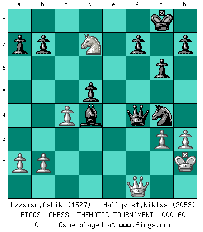 Last move : 0-1 2013 November 13 6:34:17 [Event "FICGS__CHESS__THEMATIC_TOURNAMENT__000160"] [Site "FICGS"] [Date "2013.03.17"] [Round "1"] [White "Uzzaman,Ashik"] [Black "Hallqvist,Niklas"] [Result "0-1"] [WhiteElo "1527"] [BlackElo "2053"] 1.e4 e5 2.f4 exf4 3.Nf3 Ne7 4.d4 d5 5.Nc3 dxe4 6.Nxe4 Nd5 7.Bc4 Be7 8.O-O O-O 9.Qd3 Nc6 10.Bxd5 Qxd5 11.Bxf4 Bf5 12.Rae1 Rae8 13.c4 Qd7 14.d5 Nb4 15.Qb1 c6 16.Ne5 Qd8 17.Nf6+ Bxf6 18.Qxf5 cxd5 19.Nd7 Bd4+ 20.Kh1 Rxe1 21.Rxe1 g6 22.Qh3 Re8 23.Rxe8+ Qxe8 24.Bd2 Qe2 25.Qf3 Qxd2 26.Qf1 Nd3 27.h3 Nf2+ 28.Kh2 Qf4+ 29.g3 Ng4+ 0-1 This chess game has been lost on time (started : 2013.03.17 23:6:39) KGA : Bonsch-Osmolovsky variation Kingside Castling by player White (move 8) Kingside Castling by player Black (move 8) Player Black won this chess game. Follow this game move after move (download)Fischer Chess play was always razor-sharp, rational and brilliant. One of the best ever. (Dave Regis) Ich las kürzlich ein Buch von Nietzsche. Er sagte Religion verdumme nur die Menschen. Ich stimme zu. (Robert James Fischer) El Ajedrez es la vida. (Bobby Fischer) Tous ces prétendus hommes politiques sont les pions, les Cavaliers, les Tours ou les Fous d'une partie d'échecs qui se jouera tant qu'un hasard ne renversera pas l'échiquier. (Honoré de Balzac) Men never do evil so completely and cheerfully as when they do it from religious conviction. (Blaise Pascal)