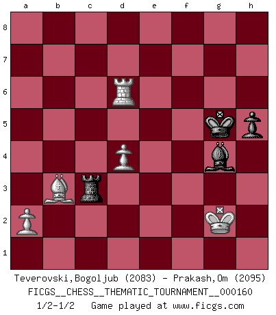 Last move : 1/2-1/2 2013 September 4 13:34:33 [Event "FICGS__CHESS__THEMATIC_TOURNAMENT__000160"] [Site "FICGS"] [Date "2013.03.17"] [Round "1"] [White "Teverovski,Bogoljub"] [Black "Prakash,Om"] [Result "1/2-1/2"] [WhiteElo "2083"] [BlackElo "2095"] 1.e4 e5 2.f4 exf4 3.Nf3 g5 4.h4 g4 5.Ne5 Nf6 6.d4 d6 7.Nd3 Nxe4 8.Bxf4 Bg7 9.Nc3 Nxc3 10.bxc3 O-O 11.Be2 c5 12.O-O Qxh4 13.Qe1 Qe7 14.Qf2 Nc6 15.Rae1 Qd8 16.Be3 b6 17.Nf4 Qf6 18.Rd1 Re8 19.Bc4 cxd4 20.cxd4 Ne7 21.Bc1 Bd7 22.Qg3 Nf5 23.Qxg4 Rac8 24.Bb3 Re4 25.Qf3 Rce8 26.c3 Qh4 27.Qh5 Qxh5 28.Nxh5 Rh4 29.Nxg7 Kxg7 30.Rf3 Rg4 31.Rdf1 Re2 32.R3f2 Rxf2 33.Rxf2 Re4 34.Bd2 Re7 35.g4 Nh6 36.Bg5 Re1+ 37.Kg2 Bxg4 38.Bxh6+ Kxh6 39.Rxf7 Re3 40.Rxa7 Rxc3 41.Ra6 Kg5 42.Rxb6 h5 43.Rxd6 1/2-1/2 KGA : Kieseritsky, Berlin defense Kingside Castling by player Black (move 10) Kingside Castling by player White (move 12) 10 pieces endgame at move 42 : White KRBPP , Black KRBPP WHITE : King + 1 Rook 1 Bishop 2 Pawns BLACK : King + 1 Rook 1 Bishop 2 Pawns 9 pieces endgame at move 43 : White KRBPP , Black KRBP WHITE : King + 1 Rook 1 Bishop 2 Pawns BLACK : King + 1 Rook 1 Bishop 1 Pawn This chess game ended in a draw. Follow this game move after move (download)What is the object of playing a gambit opening?... To acquire a reputation of being a dashing player at the cost of losing a game. (Siegbert Tarrasch) Im Spitzenschach von heute geht es nur um Vorbereitung, um tiefgründige, sorgfältige Eröffnungsvorbereitung. (Nigel Short) Cada Peón es una Reina en potencia. (James Mason) Tout change constamment, y compris dans le monde des Echecs. (Botvinnik) Strategy without tactics is the slowest route to victory. Tactics without strategy is the noise before defeat. (Sun Tzu)