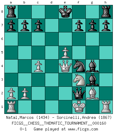 Last move : 0-1 2013 April 15 3:3:27 [Event "FICGS__CHESS__THEMATIC_TOURNAMENT__000160"] [Site "FICGS"] [Date "2013.03.17"] [Round "1"] [White "Natal,Marcos"] [Black "Sorcinelli,Andrea"] [Result "0-1"] [WhiteElo "1434"] [BlackElo "1867"] 1.e4 e5 2.f4 exf4 3.Nf3 Be7 4.d4 Bh4+ 5.g3 fxg3 6.hxg3 Bxg3+ 7.Ke2 d5 8.e5 Bg4 9.Bg2 Ne7 10.Bg5 Nbc6 11.Nbd2 Nxd4+ 12.Kf1 Ne6 13.Bxe7 Qxe7 14.c4 Qc5 15.Qe2 Nf4 16.Ne4 dxe4 17.Qxe4 Qf2+ 0-1 KGA : Cunningham defense Player Black won this chess game. Follow this game move after move (download)First-class players lose to second class players because second-class players sometimes play a first-class game. (Tarrasch) Garry Kasparov war erst in der Großmeister-Organisation GMA, dann in der Profischach-Vereinigung PCA, zum Schluss kehrte er wieder in den Schoß der FIDE zurück. Aber gut, manche Leute sind flexibel (Viswanathan Anand) De todos mis libros Rusos, la defensa contiene y difunde el 'calor' mas grande que pudiese verse extraño al observar lo supremamente abstracto que el Ajedrez supuestamente es. (Vladimir Nabokov) Il a essayé de se convaincre qu'il pourrait empêcher toutes les erreurs et ne jamais perdre. L'horreur ! Gary Kasparov au sujet de Robert Fischer. Animated gif is worth one mega-word. (Unknown)